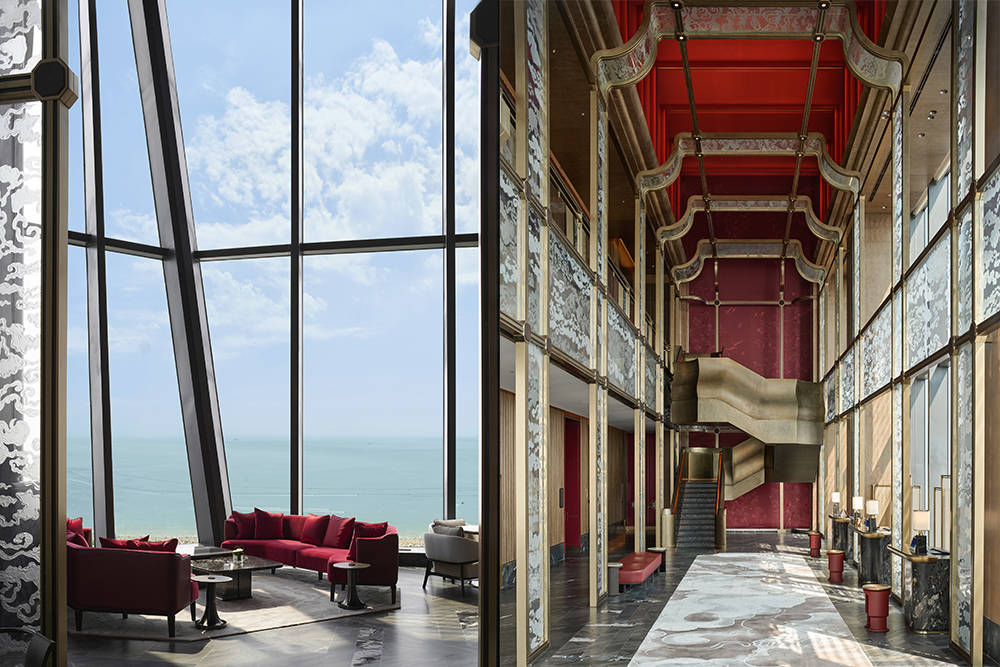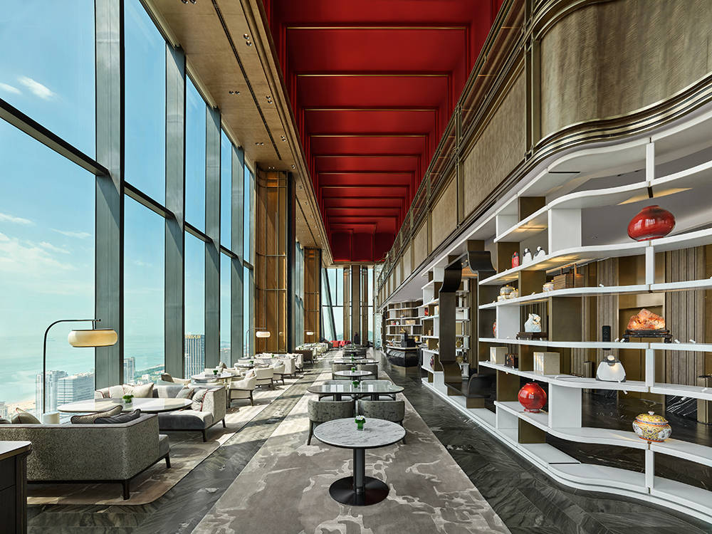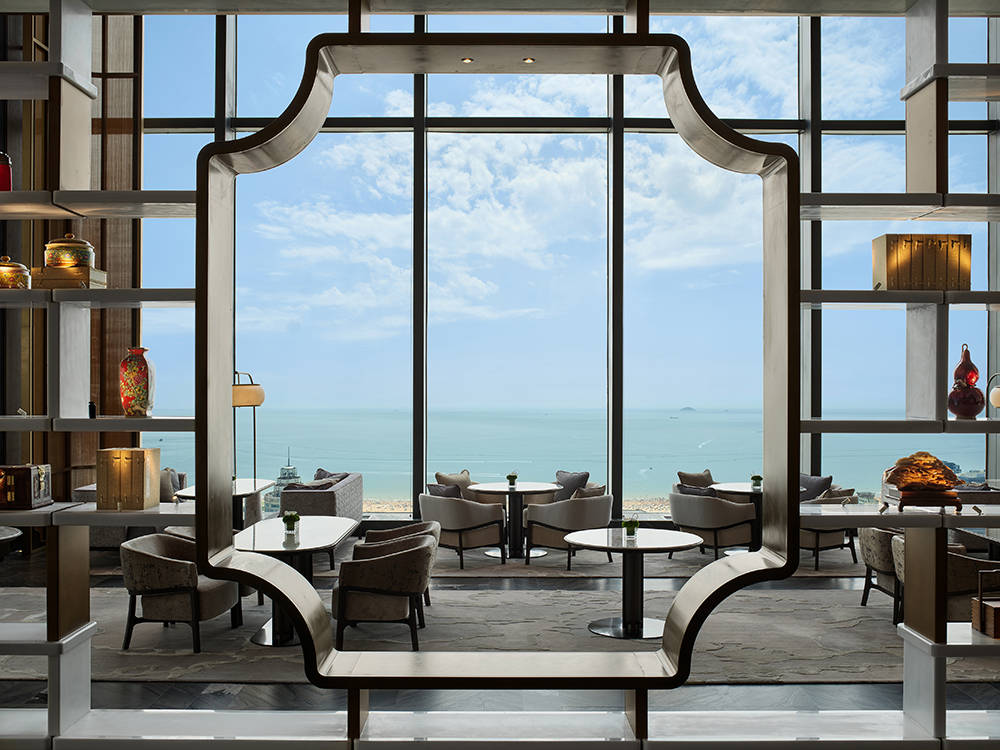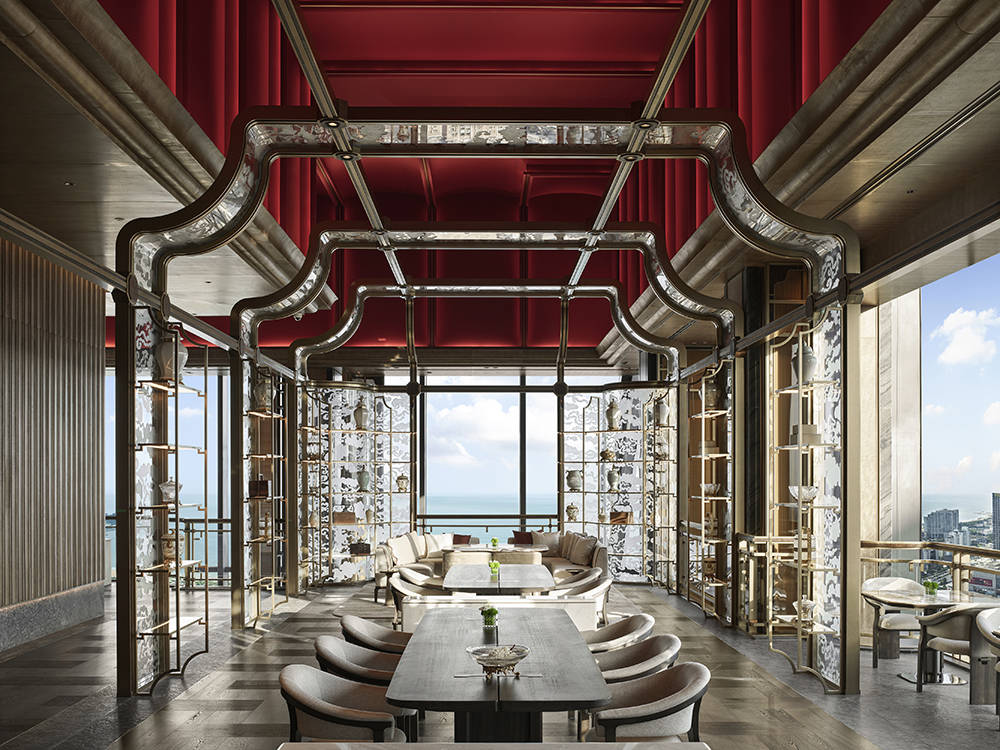 入口庭院中,著名艺术家任天进创作的白铜胡杨雕塑《千年》静立,以不朽材质凝铸时间力量,为空间注入坚韧而沉静的精神意象。穿庭而入,一座名为《启云》的当代艺术雕塑便映入眼帘,由著名雕塑大师隋建国创作,借现代材质与科技语言解构道家“有无相生”的哲思,生命痕迹隐于造型肌理,静立迎候八方来宾。首层抵达大堂萃取“海上第一名山”崂山灵韵,化作府邸专属玄关,宾客在此稍作休憩,便可乘梯直上 51 层空中大堂。登梯而至的雅境中,顶天立地的博古架巧借苏式框景之法,将海天一色收作流动画卷,亭榭形制的玻璃屏风疏朗有致,铜色旋转楼梯如飞龙踏云蜿蜒,传统意象经当代手法焕新。市花耐冬、海洋纹样等本土元素不着痕迹地融入动线。前一秒是海韵入怀的恢宏,转角便遇艺术长廊的典雅,真正实现“一步一景,步移景异”,于方寸之间尽览东方美学的万千气象。