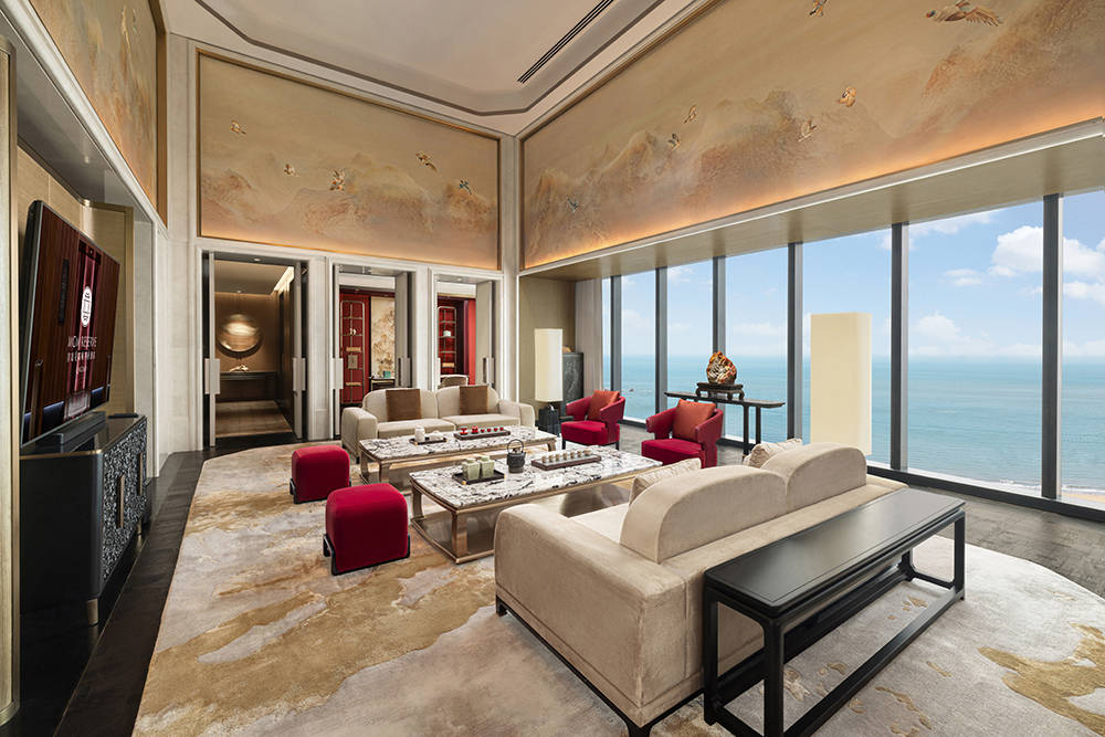 酒店共设116间客房,每一间都承载着“府邸”的居住美学。客房分别以“海洋蓝”“夕阳金”“中国红”为主题色调,融合中国宅院的秩序感与青岛山海的自然韵律,构筑出既在地又当代的生活空间。美高梅华府总统套房更藏叙事巧思,以崂山风景为核心脉络,将晨曦微熹、日出霞光、星夜静谧等不同时辰的景致色彩,层层铺陈于卧室、客厅、餐厅等空间,和谐相融,渐次递进。入住其间,仿若栖身崂山胜景之中,亲历山间时光流转的静谧与灵动。
