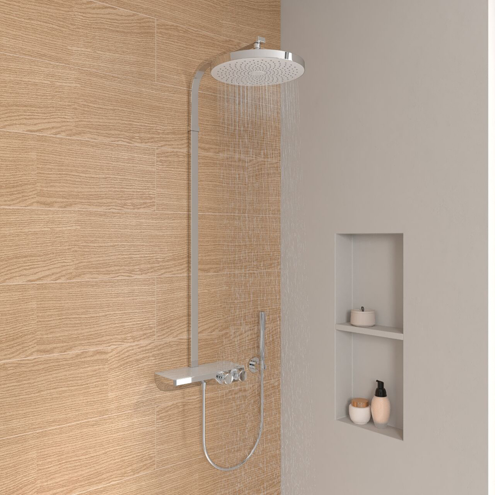 沐云小置物台淋浴杆整体采用镀铬与白色的和谐配色,结合纯粹雅致的平滑线条,为卫浴空间增添明亮轻盈的格调。300 mm 大尺寸头顶花洒,使柔和细腻的水流包裹全身,营造沉浸式感官享受;麦克风型手持花洒造型简约精致,握感顺滑流畅,带来自在惬意的日常体验。精简置物台与恒温龙头浑然一体,将水路控制、水流控制、水温调节与收纳功能集成于方寸之间,赋予都市卫浴生活有条不紊的秩序感。内置高品质62黄铜材质的恒温混水阀体,不仅确保水温恒定,其强大的抗脱锌腐蚀与抗菌抑菌特性更保障用水安心,让生活的温馨在每一次沐浴中悄然流转。
