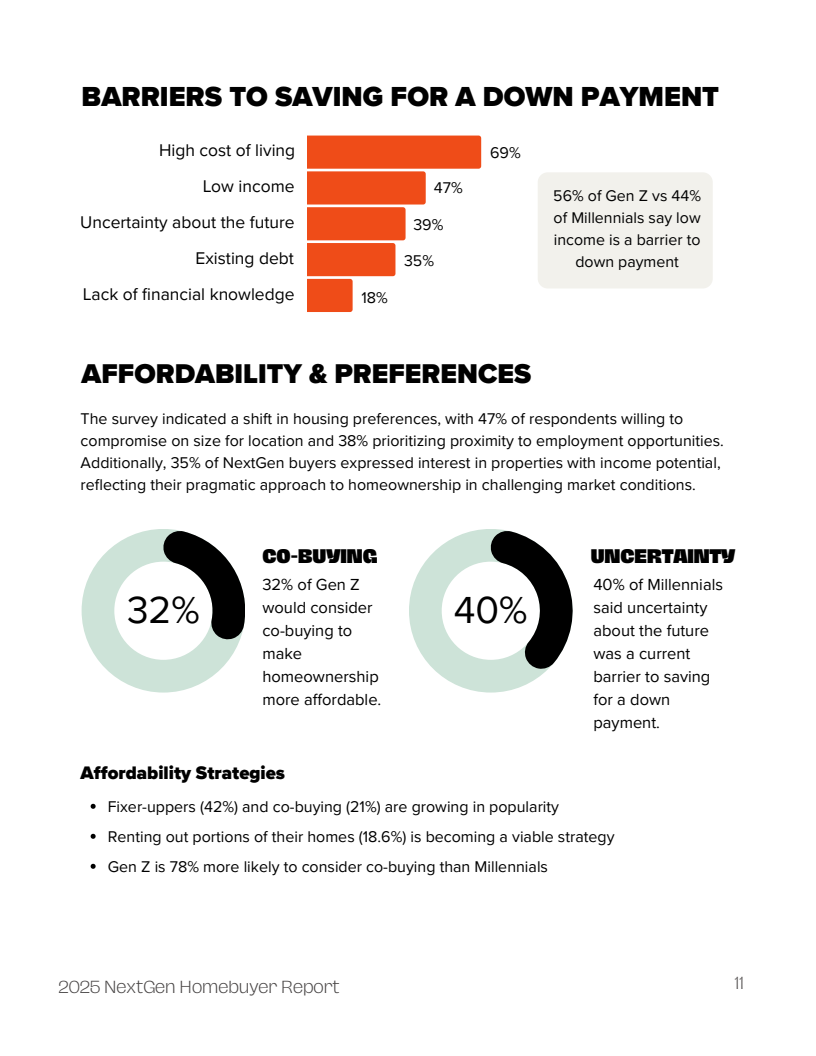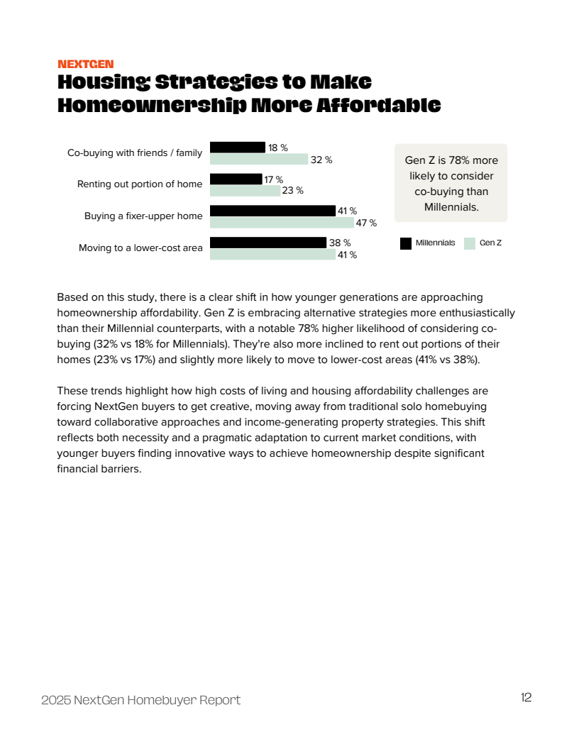 面对现实压力,购房者正积极拥抱非传统策略以规避支付能力不足的困境。购买待修缮房屋(42%)、联合购房(21%)以及“房屋黑客”(House Hacking,出租部分房屋分摊贷款,19%)等创新模式日益普及。特别是在Z世代中,高达32%的人考虑联合购房,这一比例远高于千禧一代的18%,显示出更强的财务灵活性与合作意愿。