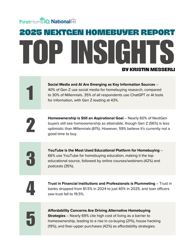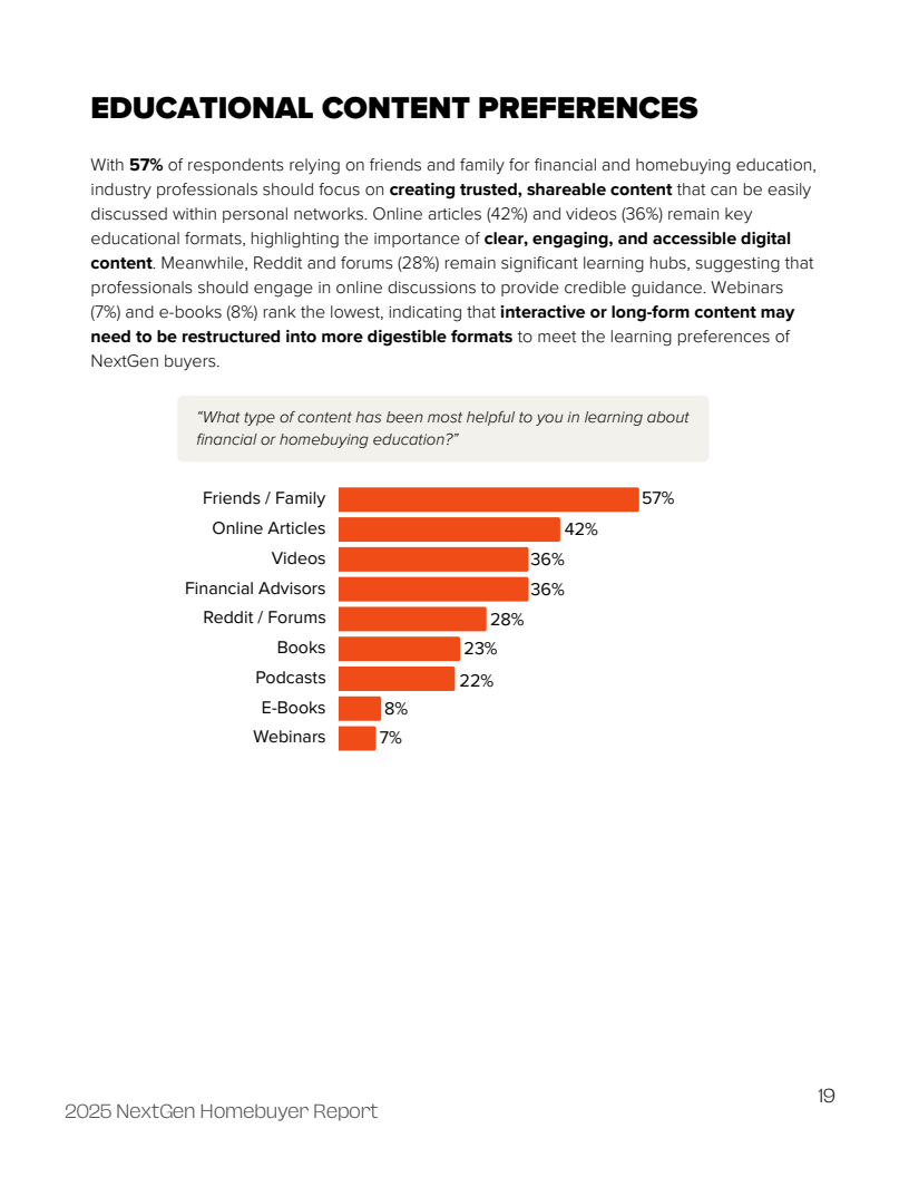信任的流失正从根本上重塑信息获取路径。高达66%的受访者将YouTube视为购房教育的首选平台,凸显了视频化、非正式学习渠道的主导地位。尤其值得关注的是,40%的Z世代(18-24岁)通过社交媒体进行购房研究,35%的受访者已开始使用ChatGPT等人工智能工具获取信息,其中Z世代的使用率更是达到43%,远超千禧一代。