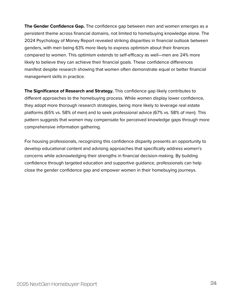 这些挑战的背后,是金融素养的普遍缺失。超过半数(53%)的受访者表示在校期间未接受过正式的个人理财教育,另有29%表示相关课程仅为选修或简短介绍。这种教育缺失直接导致了信心的不足,Z世代中仅有43%的人对自己的理财知识有信心,显著低于千禧一代的53%。女性在购房知识方面的信心度(38%)也明显低于男性(47%)。