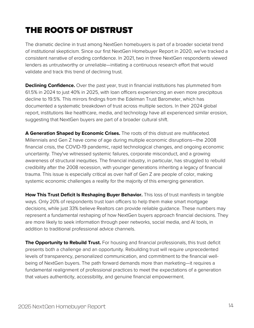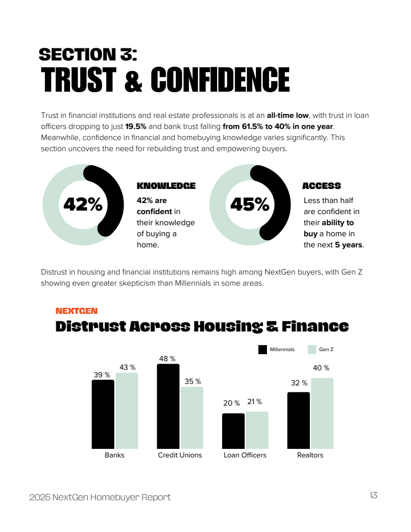 新生代购房者的市场图景正经历一场深刻的结构性变革,其核心标志是信任的崩塌。数据显示,潜在购房者对银行的信任度从2024年的61.5%骤降至2025年的40%,而对贷款专员的信任度更是从高位断崖式下跌至仅19.5%。这一信任赤字并非孤立事件,而是经济不确定性与信息获取方式变革共同作用的结果,预示着传统金融服务模式面临严峻挑战。