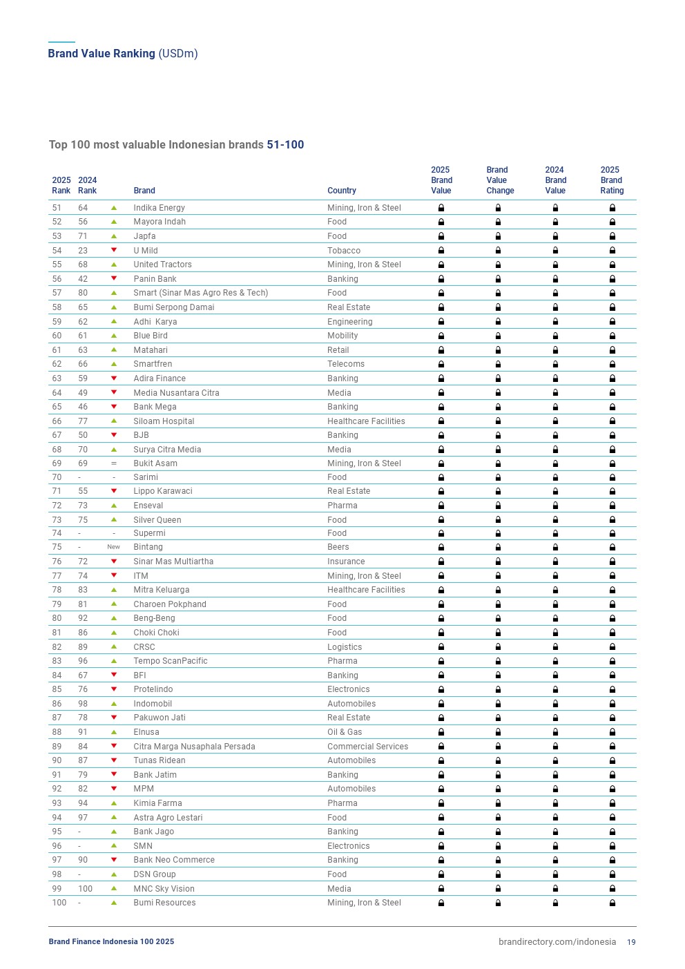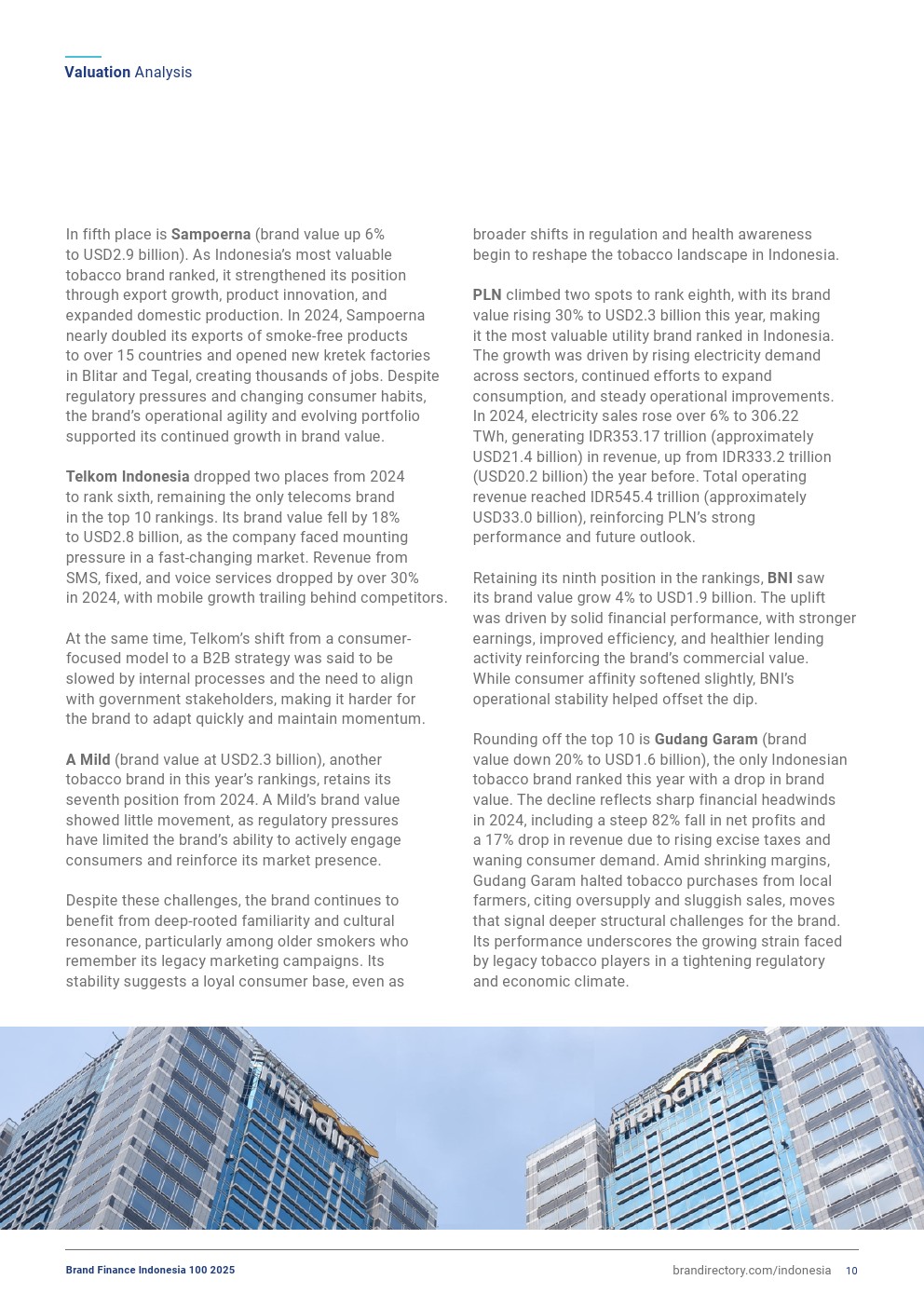 PLN上升两位至第八名,品牌价值增长30%,达到23亿美元,成为印尼最具价值的公用事业品牌。这一增长源于电力需求上升、消费扩大和运营改善,体现在2024年强劲的销售和收入增长上。