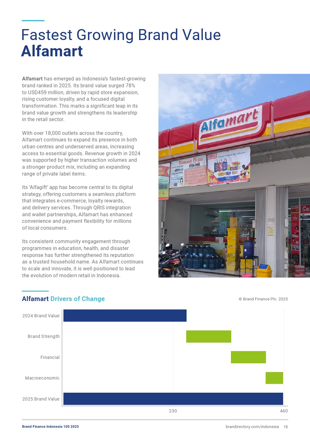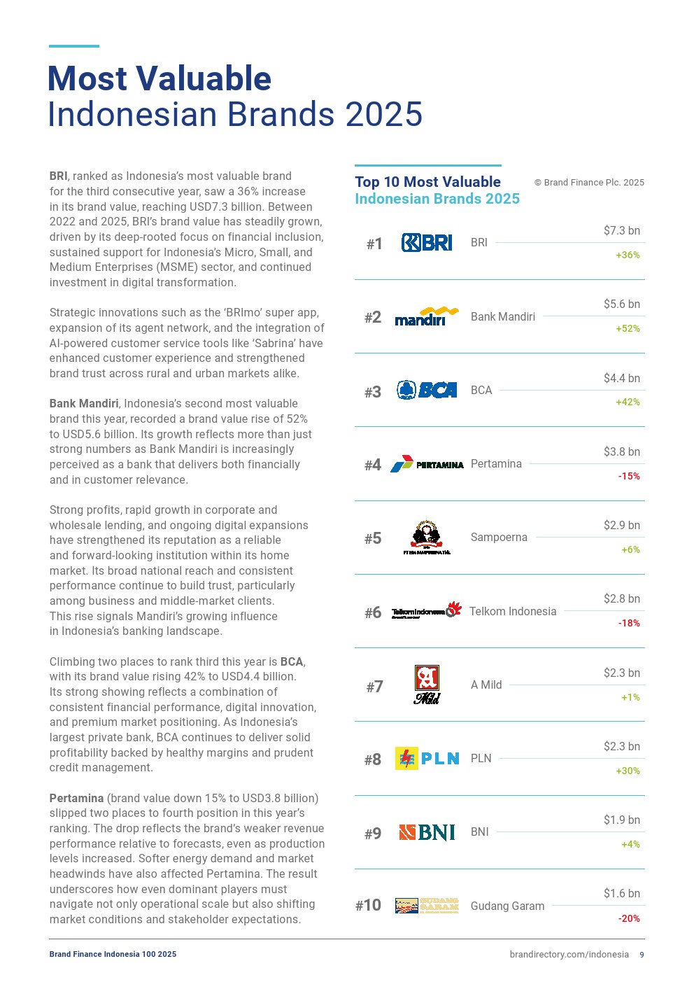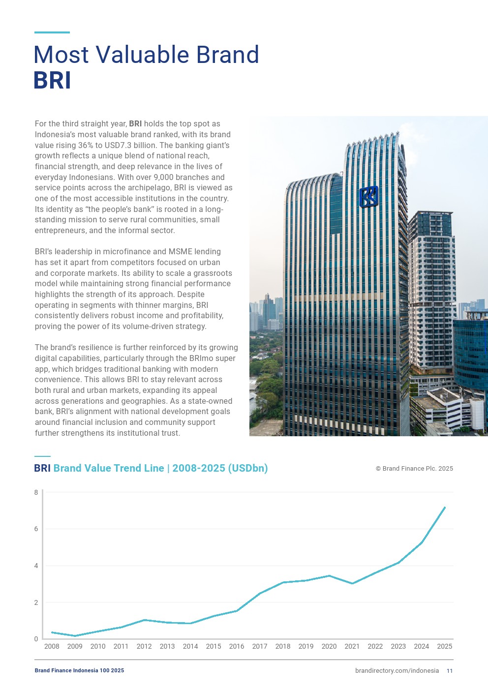 BRI连续第三年蝉联印尼最具价值品牌,其品牌价值增长36%,达到73亿美元。2022至2025年间,BRI品牌价值的增长源于其对金融包容性的承诺、对中小微企业(MSME)的大力支持以及持续推进的数字化转型。数字服务创新和网络扩展进一步提升了客户体验和信任度。