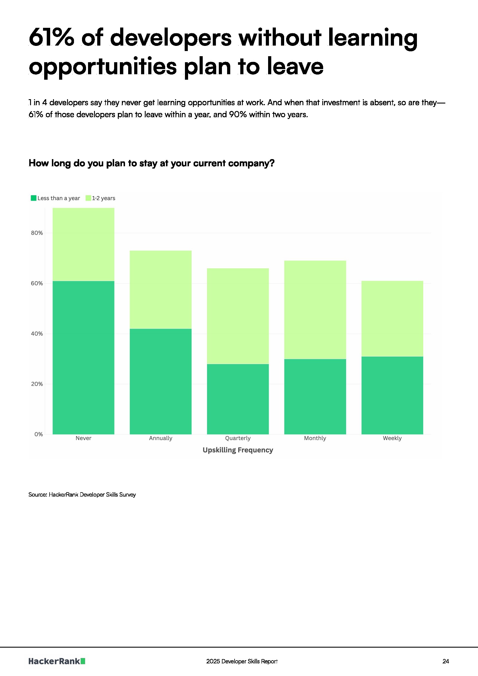 开发者不会等待公司投资他们。40%的人计划在一年内离职,优先考虑职业成长和技能发展。