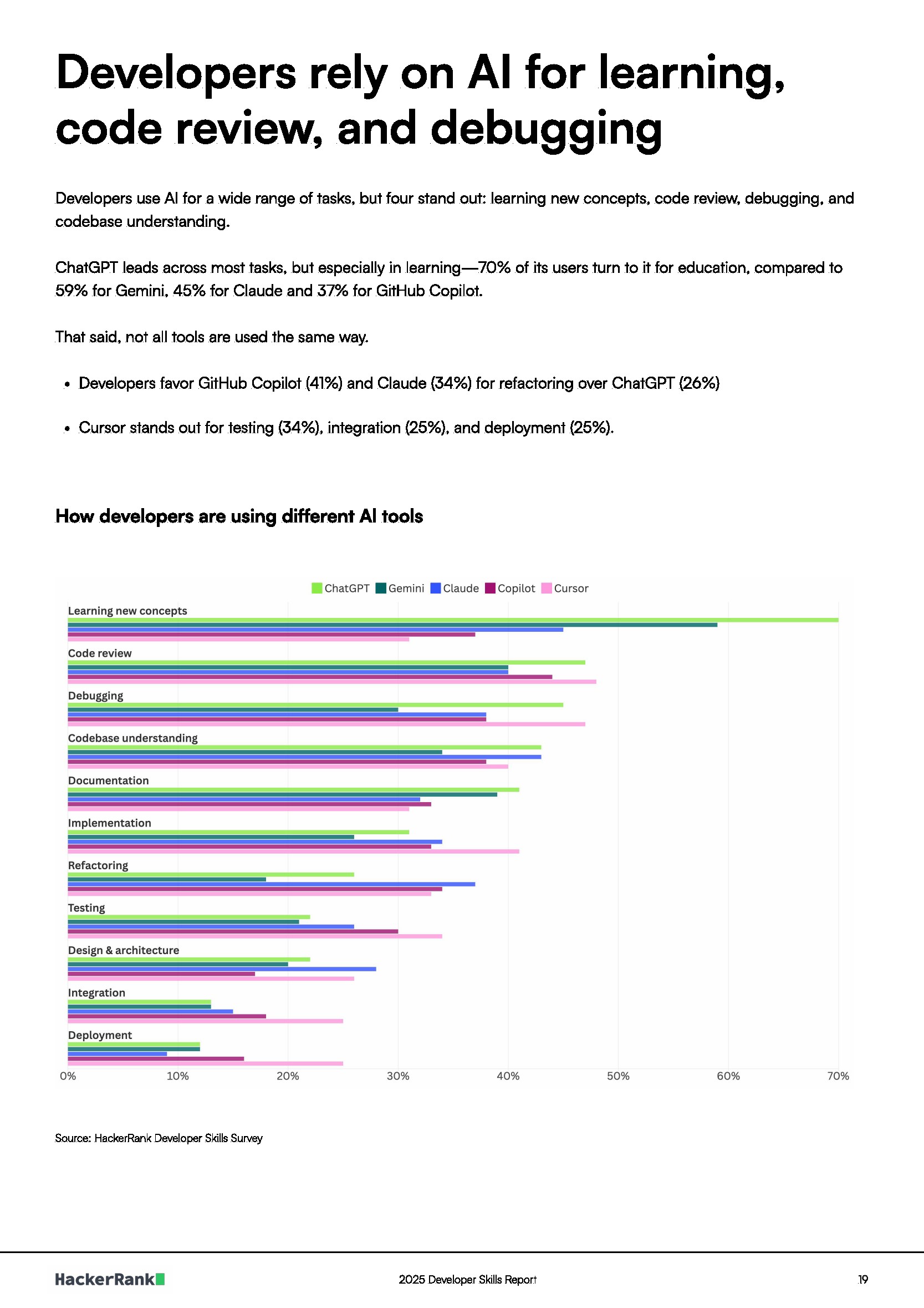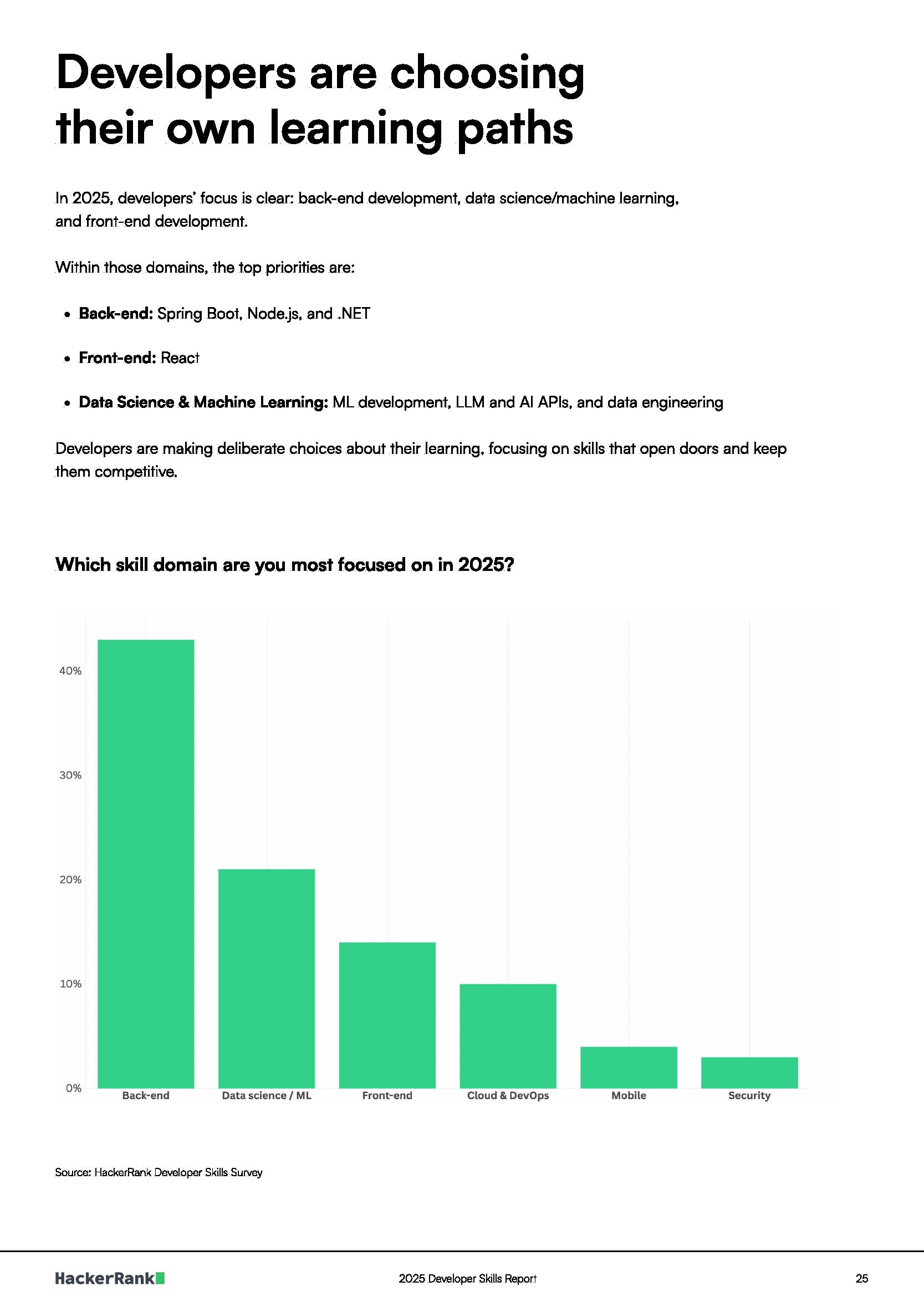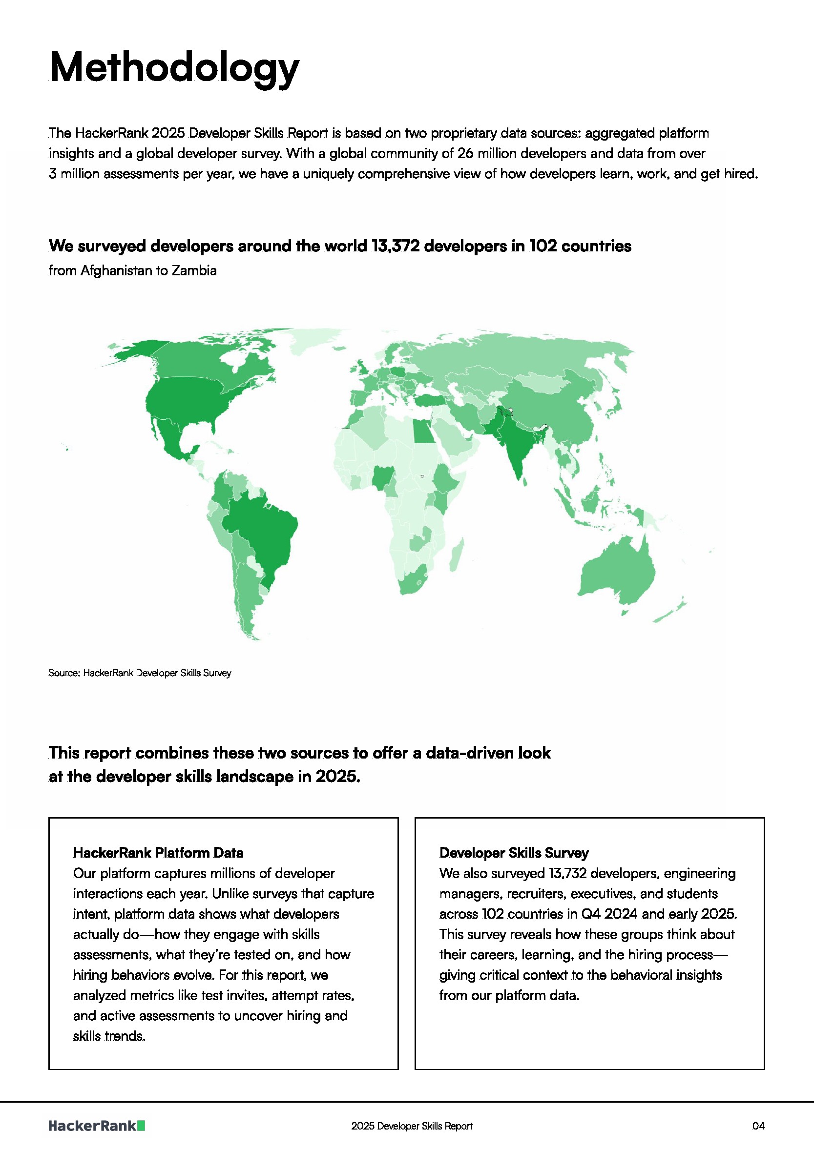 HackerRank发布了“2025年开发人员技能报告”。HackerRank 建立在一个简单的理念之上:技能应比背景更重要。其帮助公司基于真实能力而非简历关键词来招聘和发展开发人才,并支持一个拥有2600多万开发者的社区追求他们的全部潜力。