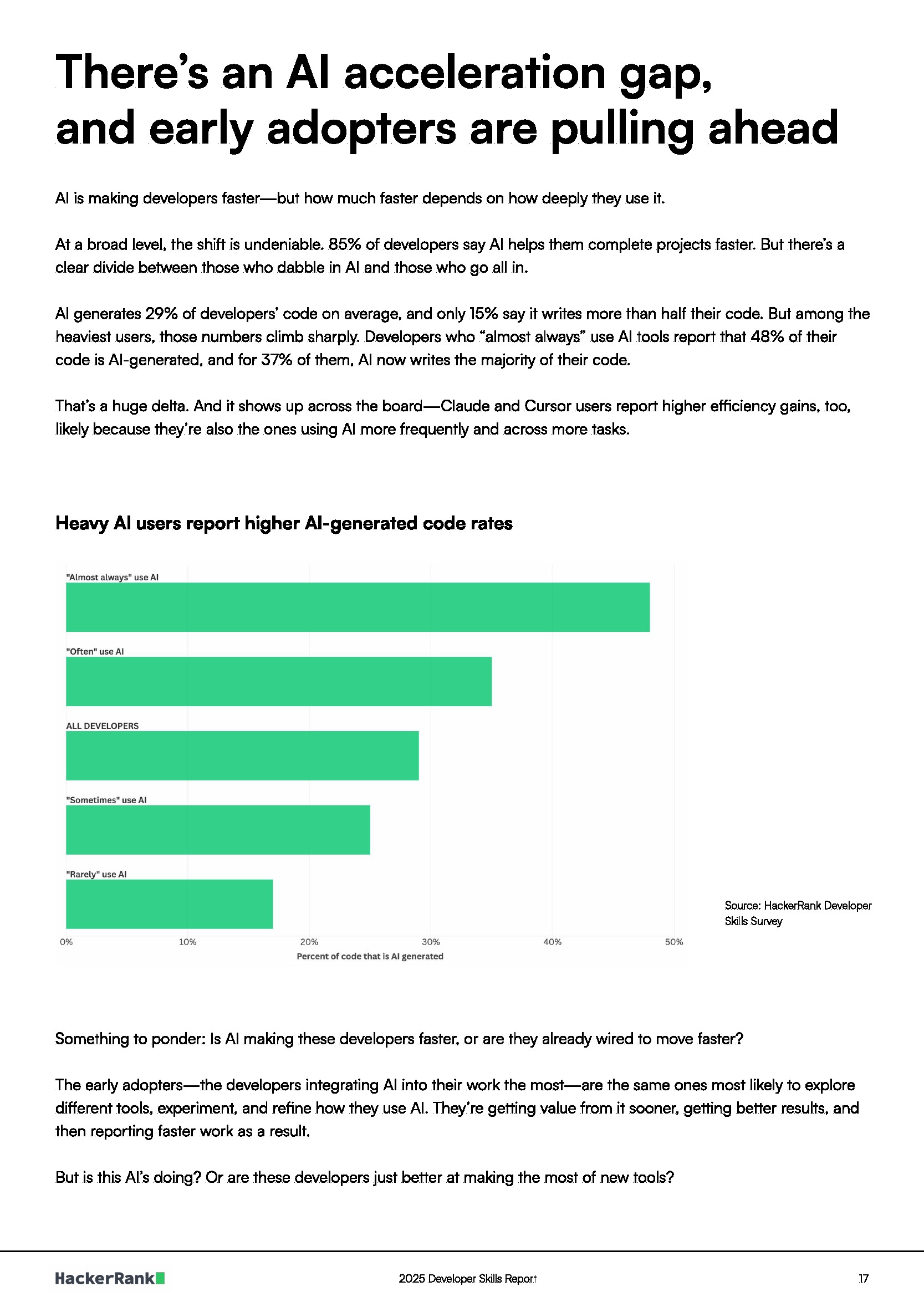 人工智能正在加速工作——但并非对每个人都平等。97%的开发者使用人工智能,但深度采用者看到更大的收益,而随意用户落后。