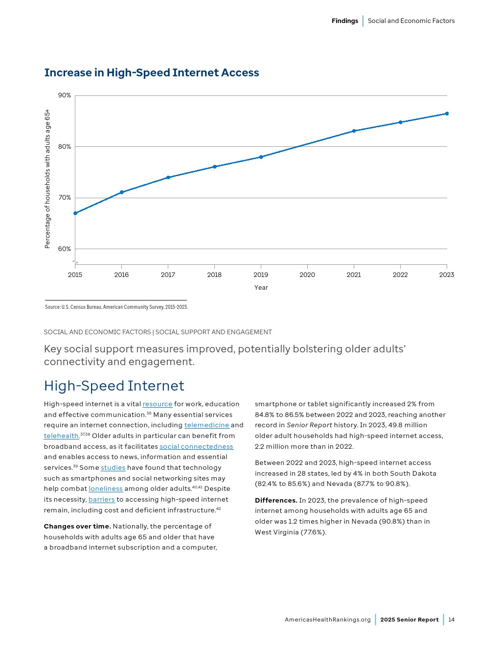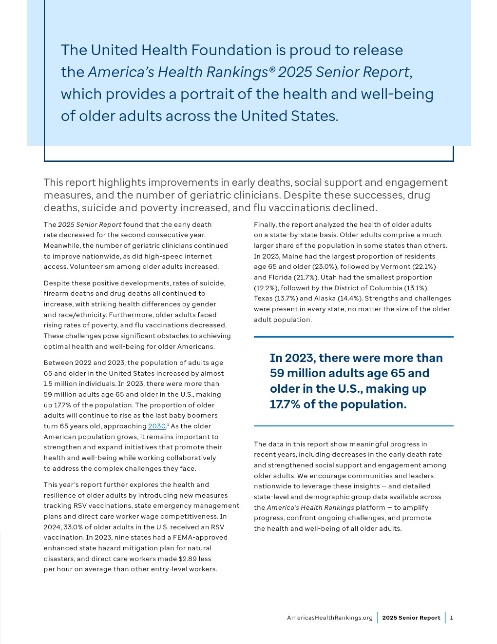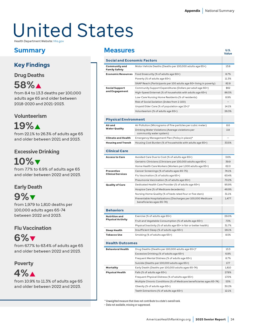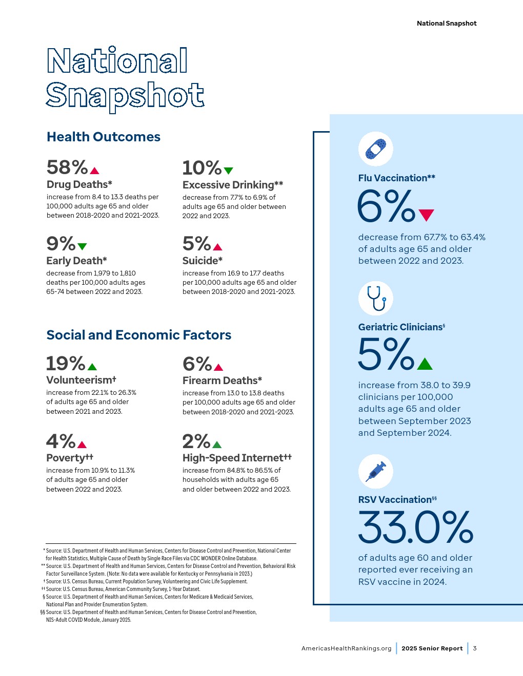 65-74岁成年人的过早死亡率已接近2019年水平,社会支持和参与度指标正在改善,老年病临床医生数量也在增加。尽管取得这些进展,药物致死和自杀案例仍达到“老年报告”历史最高水平,社会经济挑战持续存在。