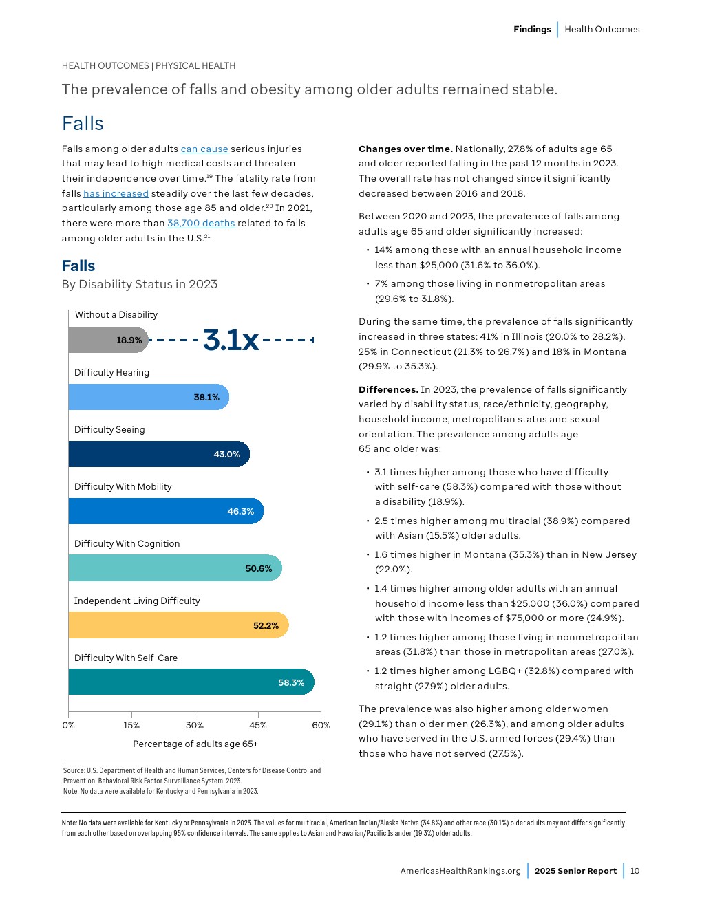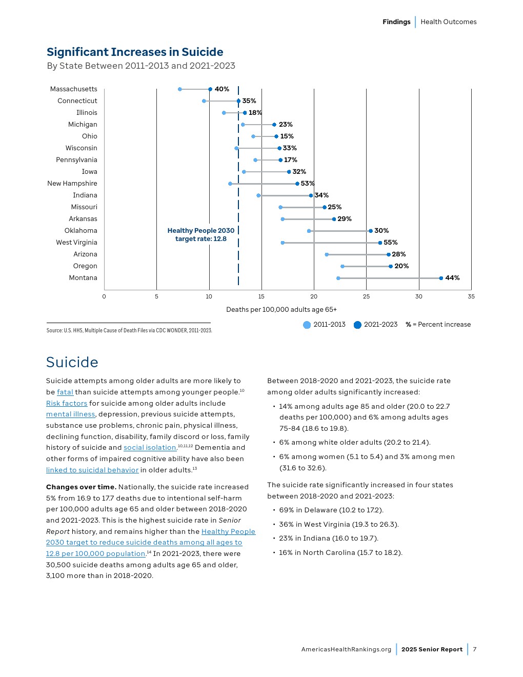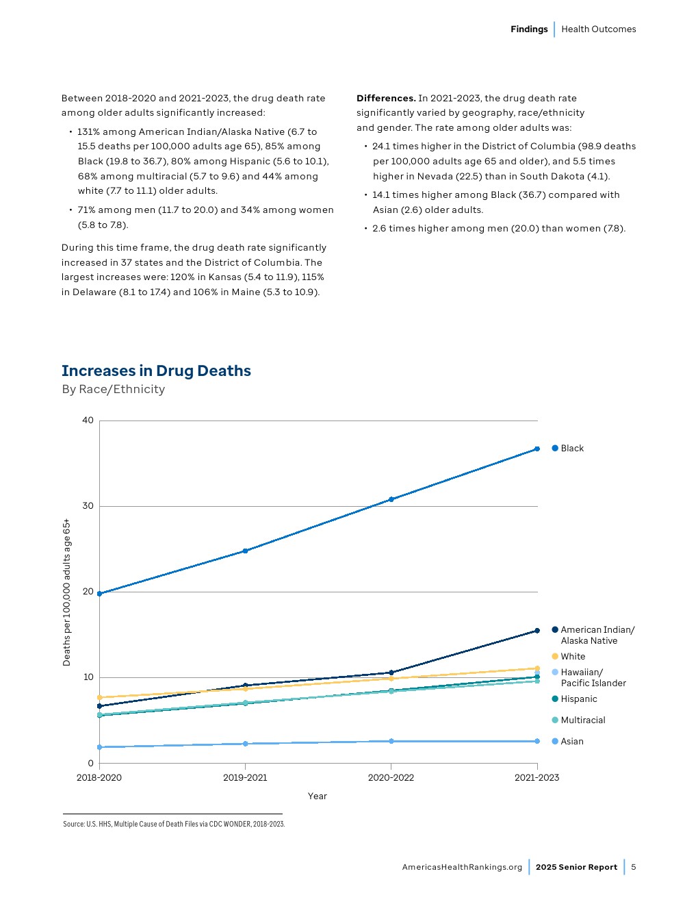 时间变化趋势。2018-2020年至2021-2023年间,全美65岁及以上老年人药物致死率(包含意外、自杀、他杀或未确定原因的药物伤害)从每10万人8.4例上升至13.3例,增幅达58%。2021-2023年期间65岁及以上老年人药物致死人数达23,000例,较2018-2020年增加9,350例。虽然老年人药物致死率仍低于“健康人民2030”设定的全年龄段药物过量致死率控制目标(每10万人20.7例),但其持续上升趋势值得警惕。