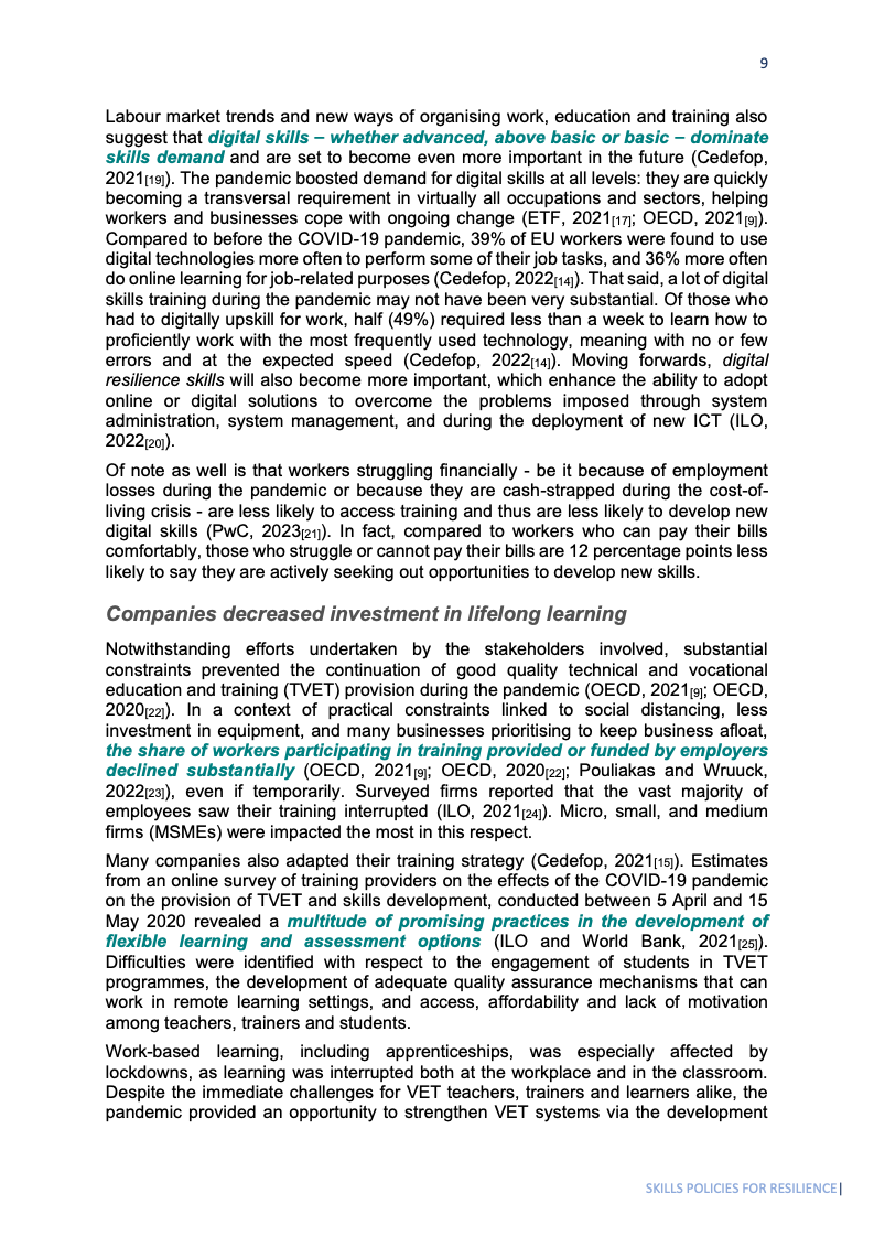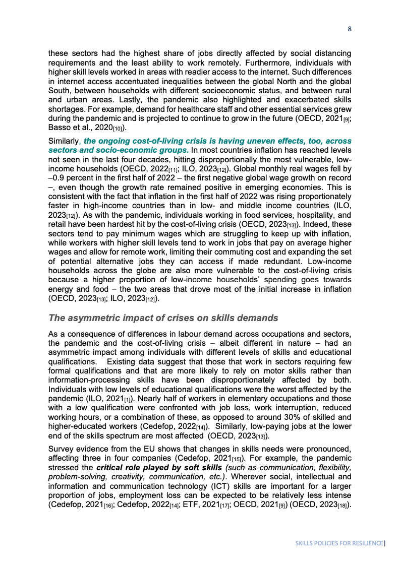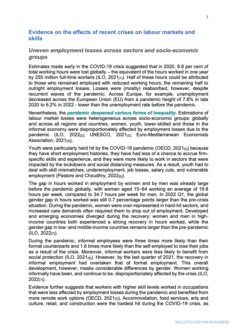 2020年,全球工时损失高达8.8%,相当于2.55亿个全职岗位,凸显了危机对劳动力市场的深度冲击。女性、青年、低技能者及非正规就业者受创最重,加剧了劳动力市场的不平等。疫情期间,由企业资助的培训参与率显著下降,尤以微型、小型、中型企业为甚,影响人才长期竞争力。