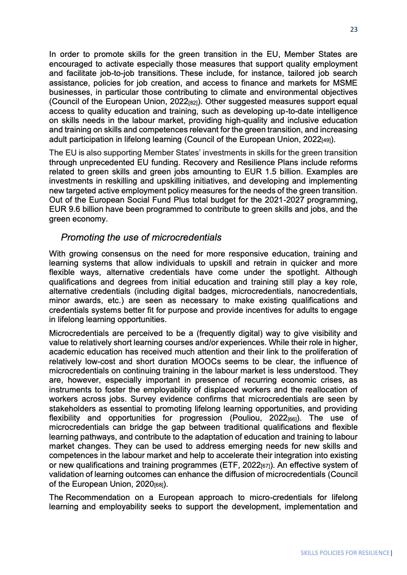 绿色转型为就业带来机遇,国际劳工组织(ILO)测算至2030年全球可新增2050万个绿色岗位。欧盟“Fit for 55”政策包预计将带来100-250万净增岗位。欧盟恢复基金1270亿欧元投向数字领域,其中257亿欧元专用于数字技能;ESF+另为数字技能单列20亿欧元。