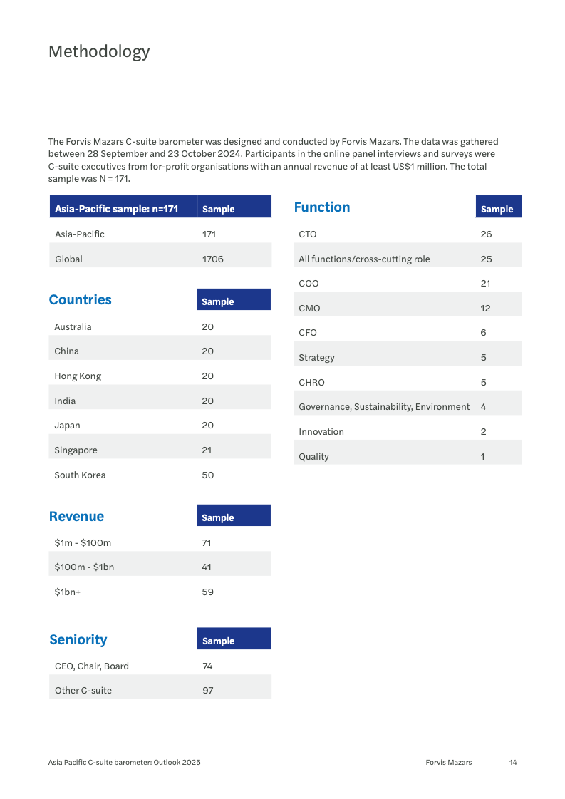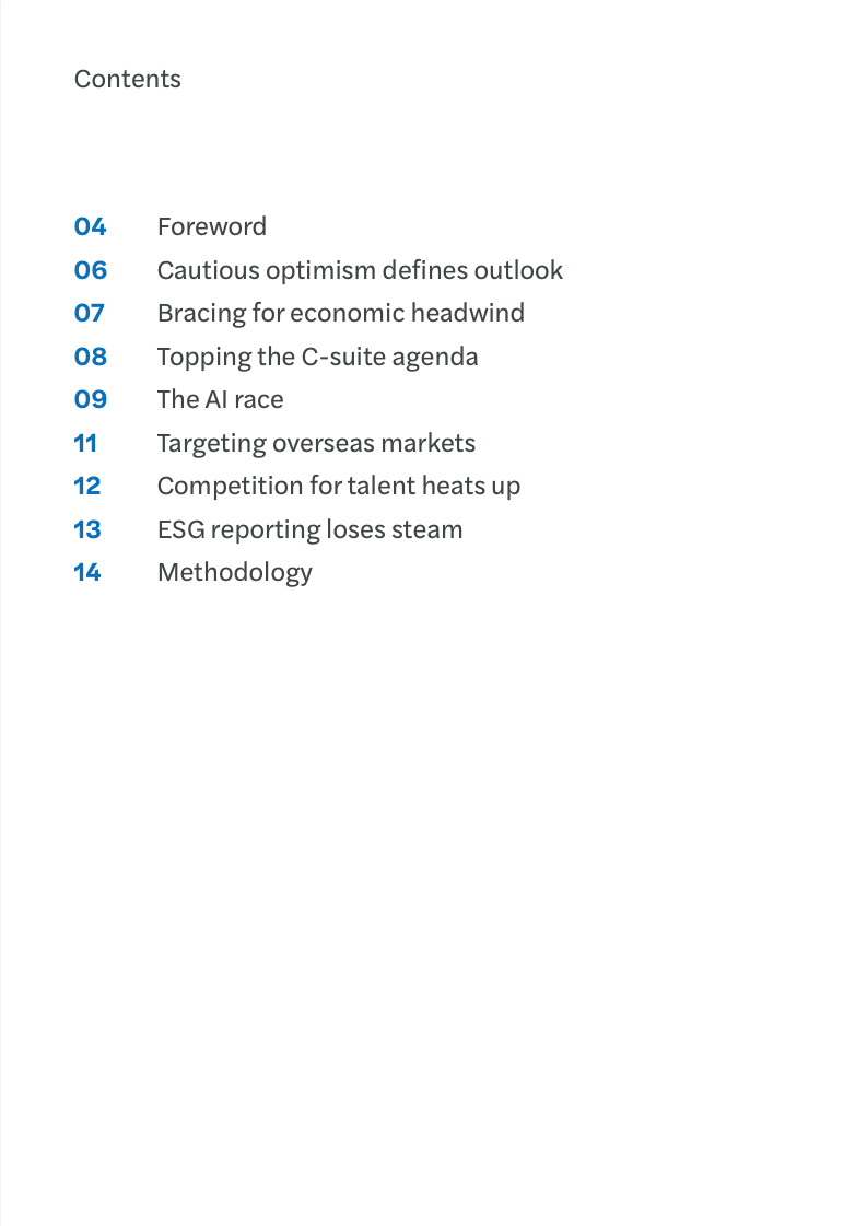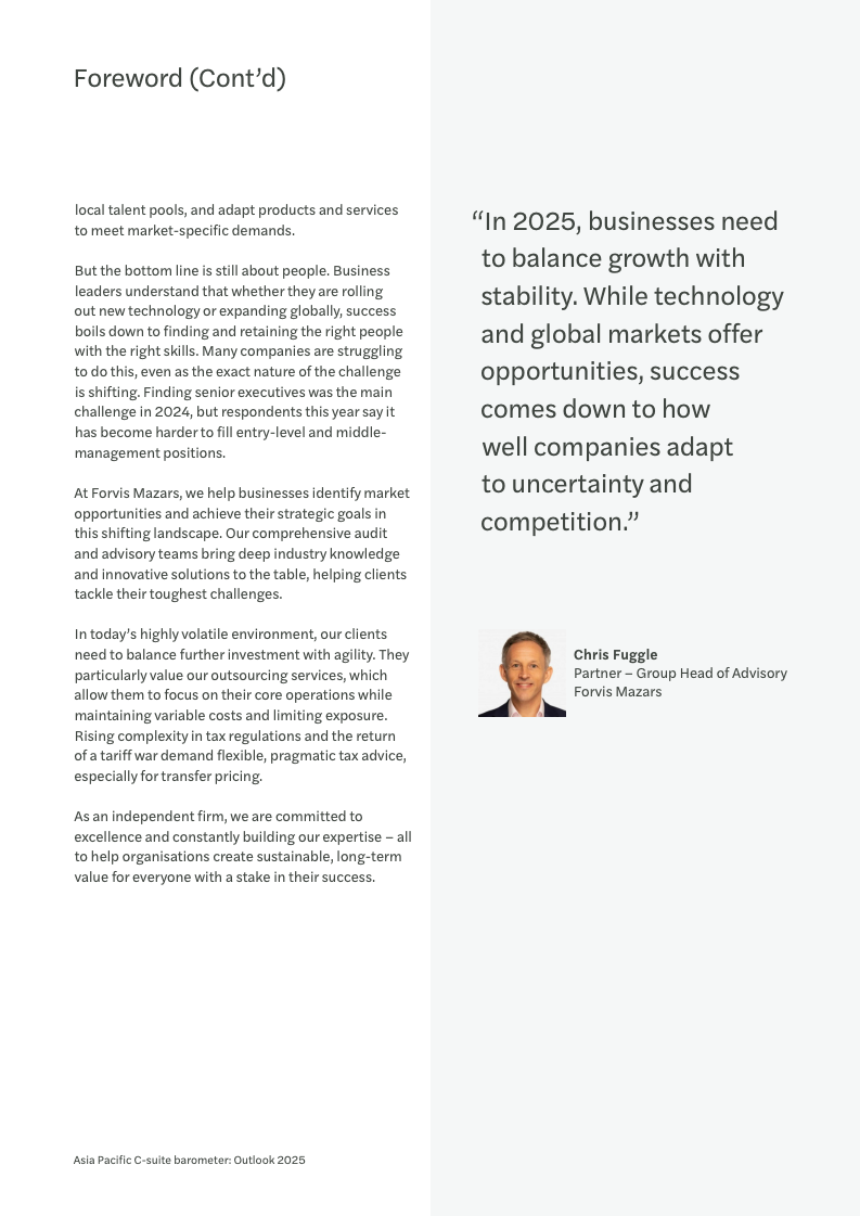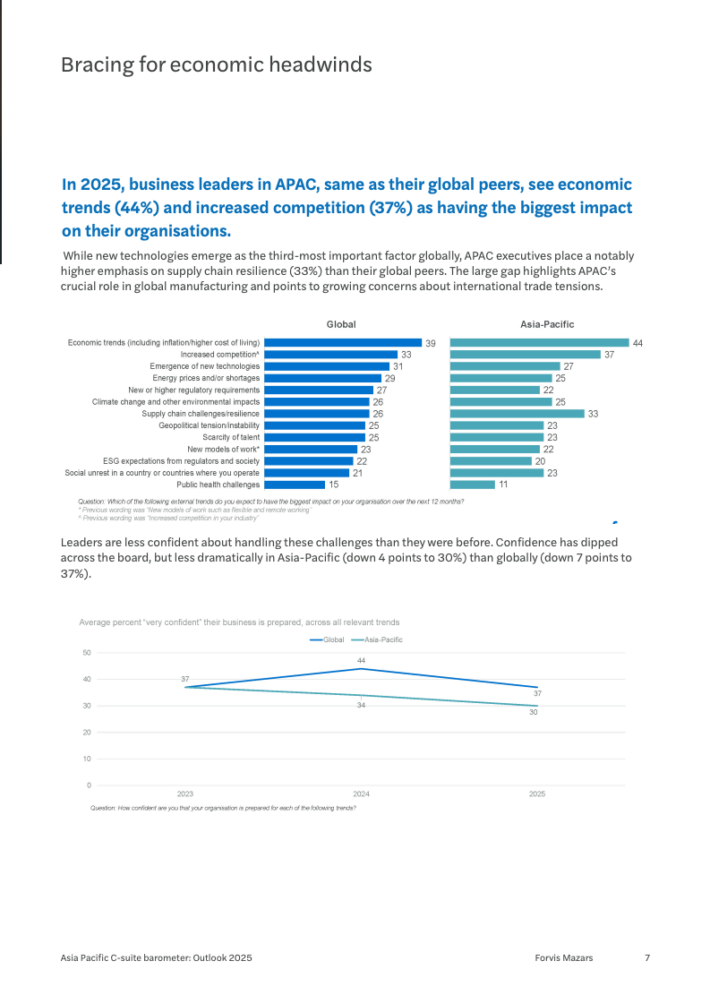 宏观经济的不确定性是笼罩在亚太商界上空最主要的阴云,47%的受访者将其列为首要关切。紧随其后的是日益激烈的市场竞争(38%)以及对供应链韧性的担忧(33%),后者在亚太地区的受关注程度显著高于全球其他地区。面对这些挑战,高管们的信心有所下滑,表示“非常有信心”应对的比例从34%降至30%,反映出经济逆风下的普遍压力。