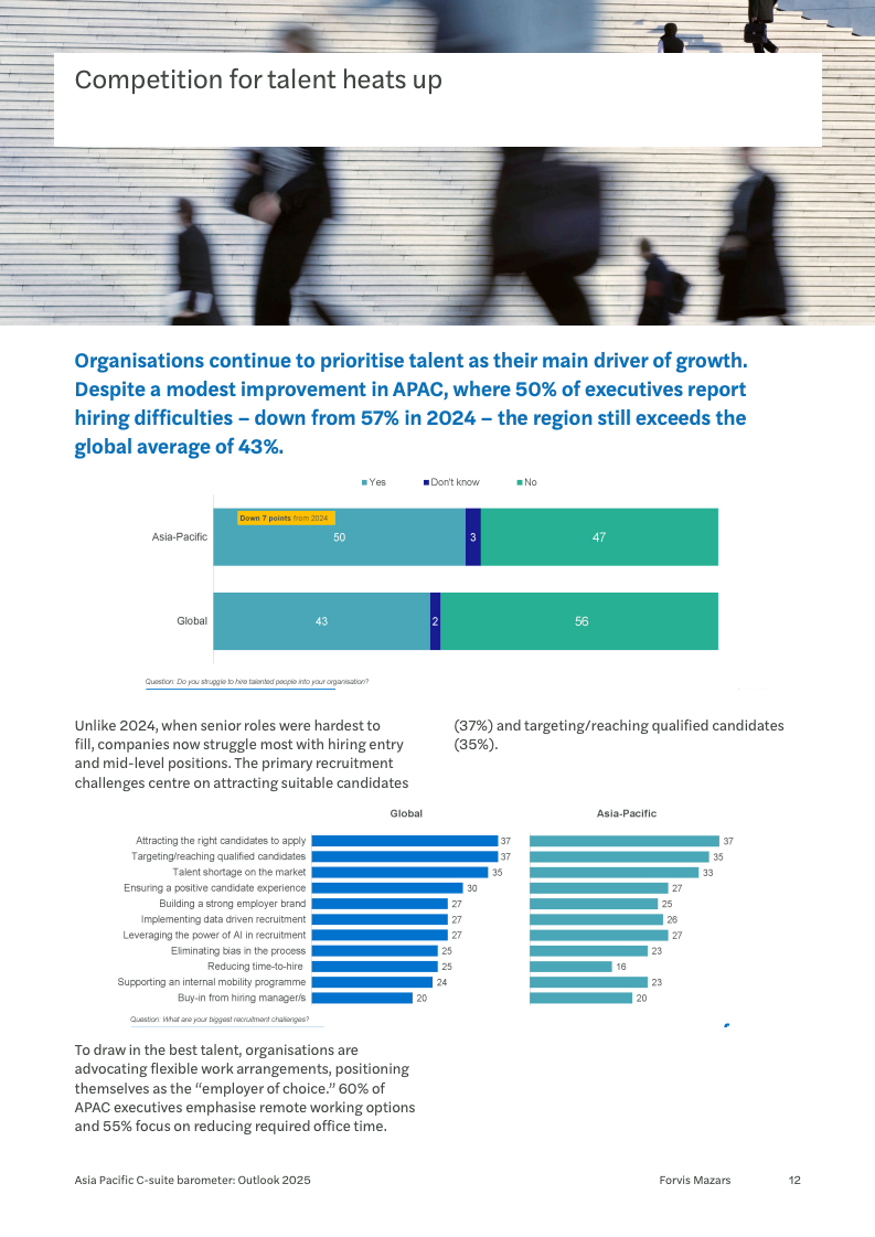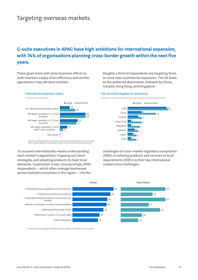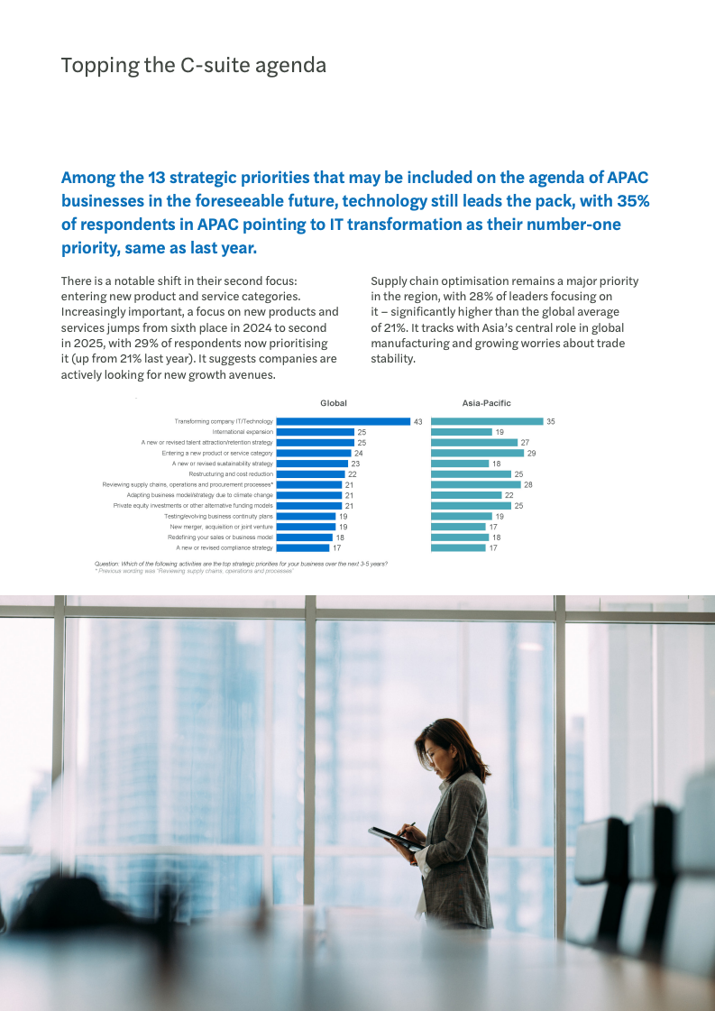 在战略布局上,亚太企业正进行着一场深刻的重心调整。信息技术转型(35%)依然是无可争议的核心优先事项,凸显了数字化在提升效率和竞争力方面的基础性作用。然而,一个显著的变化是,进入新产品与服务领域(29%)已从去年的第六位跃升至第二位,表明企业正积极寻求新的增长曲线。同时,对供应链的优化(28%)也成为关键议程,其重要性远超21%的全球平均水平。