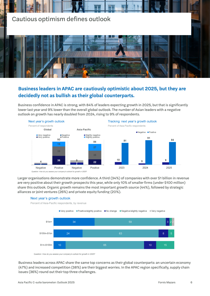 步入2025年,亚太地区的企业高管层展现出一种审慎乐观的复杂心态。尽管84%的领导者预期业务将实现增长,但这一比例不仅低于2024年的91%,也较全球同行的93%更为保守。同时,持负面展望的领导者比例从去年的5%攀升至9%,这清晰地揭示了市场信心的微妙回落,预示着企业在制定未来战略时将更加注重风险控制。