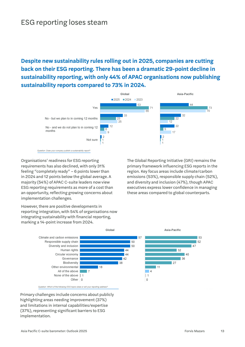 值得注意的是,环境、社会及治理(ESG)报告的热度正在迅速降温。发布可持续发展报告的亚太企业比例从2024年的73%骤降至44%,出现了29个百分点的惊人下滑。超过半数(54%)的高管认为ESG合规更多是一项成本而非机遇。这一转变反映出在经济压力下,企业可能正在重新评估其资源投入的优先次序,将焦点转向更直接的商业回报。