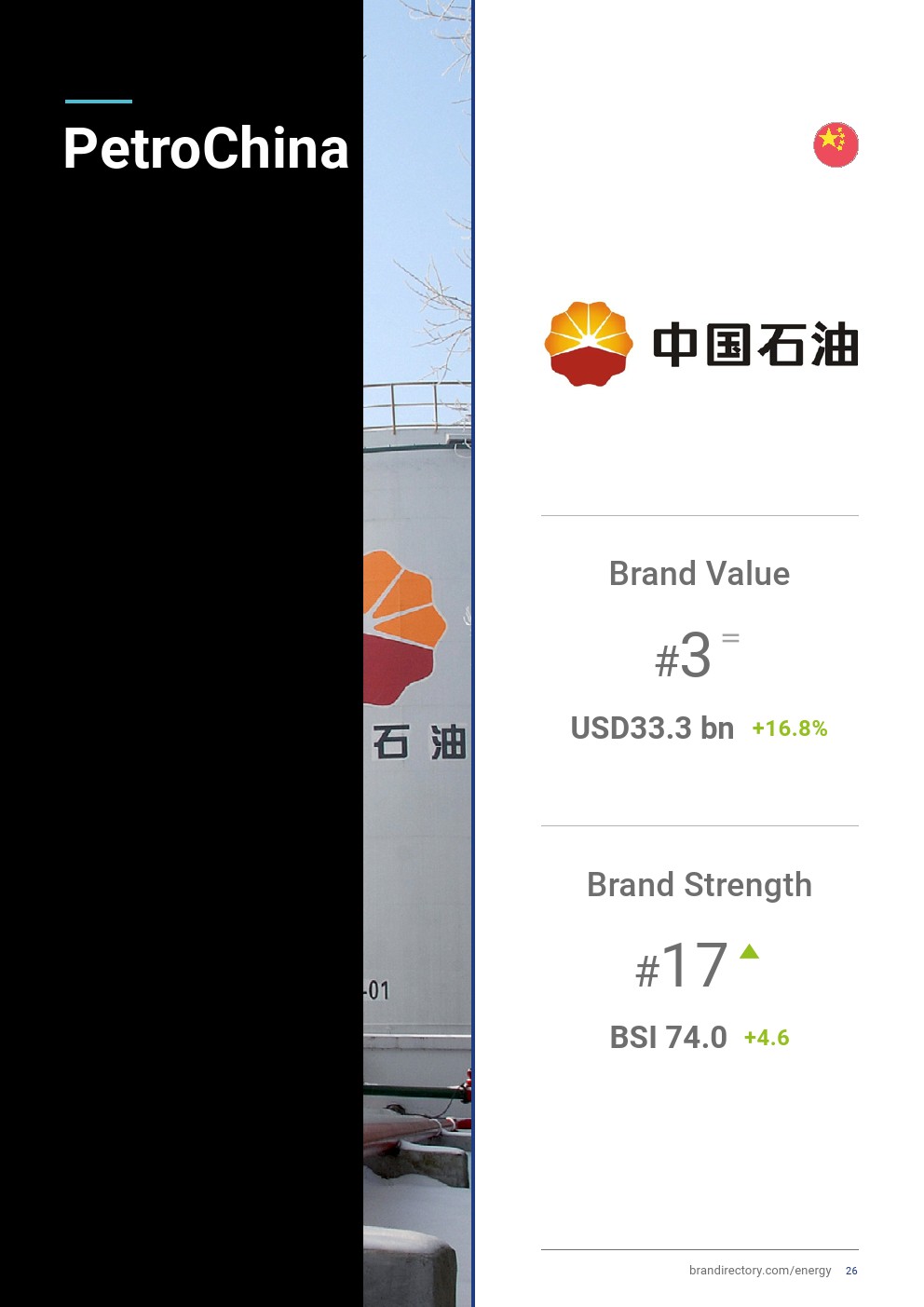 两家中国品牌——中国石油(品牌价值增长17%,达到333亿美元)和中国石化(品牌价值增长5%,达到298亿美元)保持全球顶尖品牌排名。