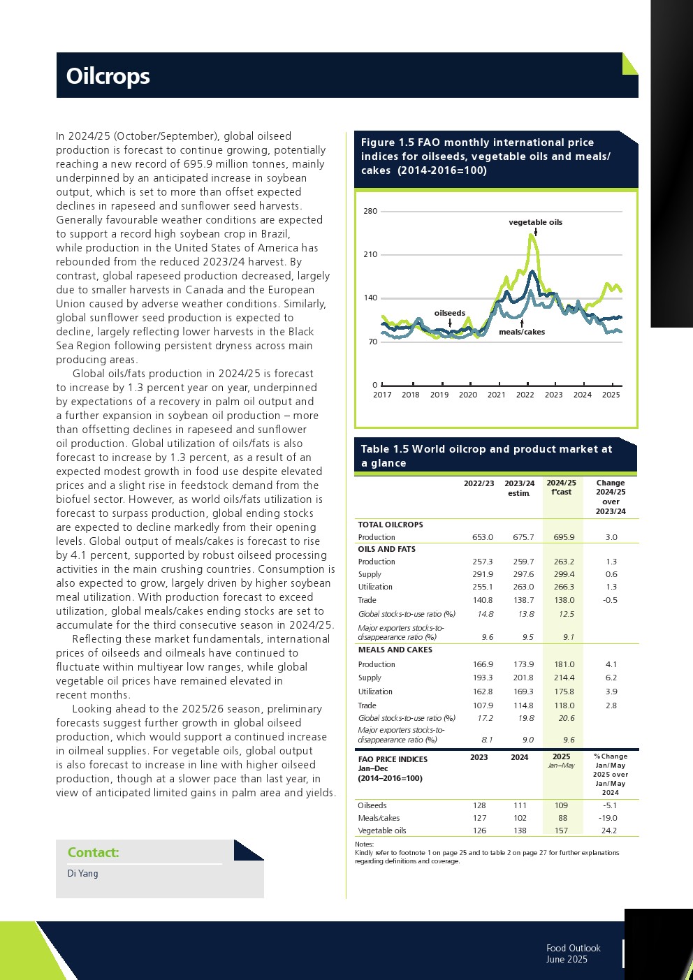 2024/25年度,创纪录的大豆产量预计将推动油粕库存进一步积累。相比之下,棕榈油/菜籽油/葵花籽油产量增长乏力,可能导致全球油脂市场持续紧张。2025/26年度早期暂定预测显示,油粕供应可能持续增加,全球油脂产量虽有望增长但增速放缓。