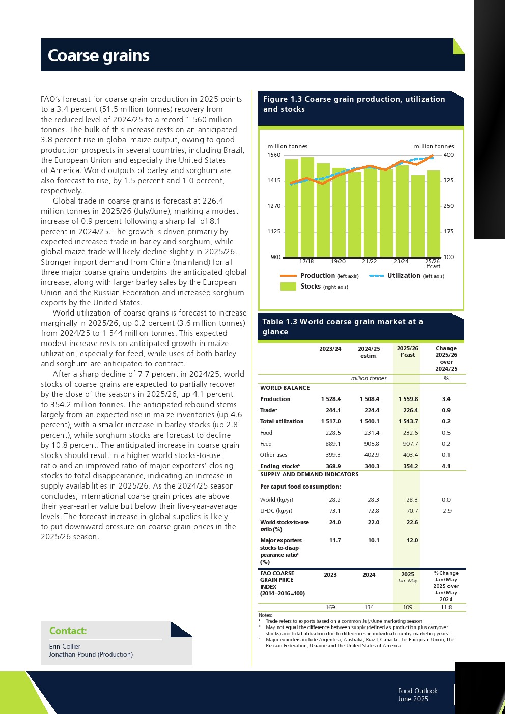 经历2024/25年度供应紧张后,粗粮价格(受玉米价格走高主导)在2025/26年度初仍高于平均水平。粮农组织初步预测显示,随着产量预期回升,2025/26年度全球粗粮供应可能增加,这将推动全球库存水平部分恢复。