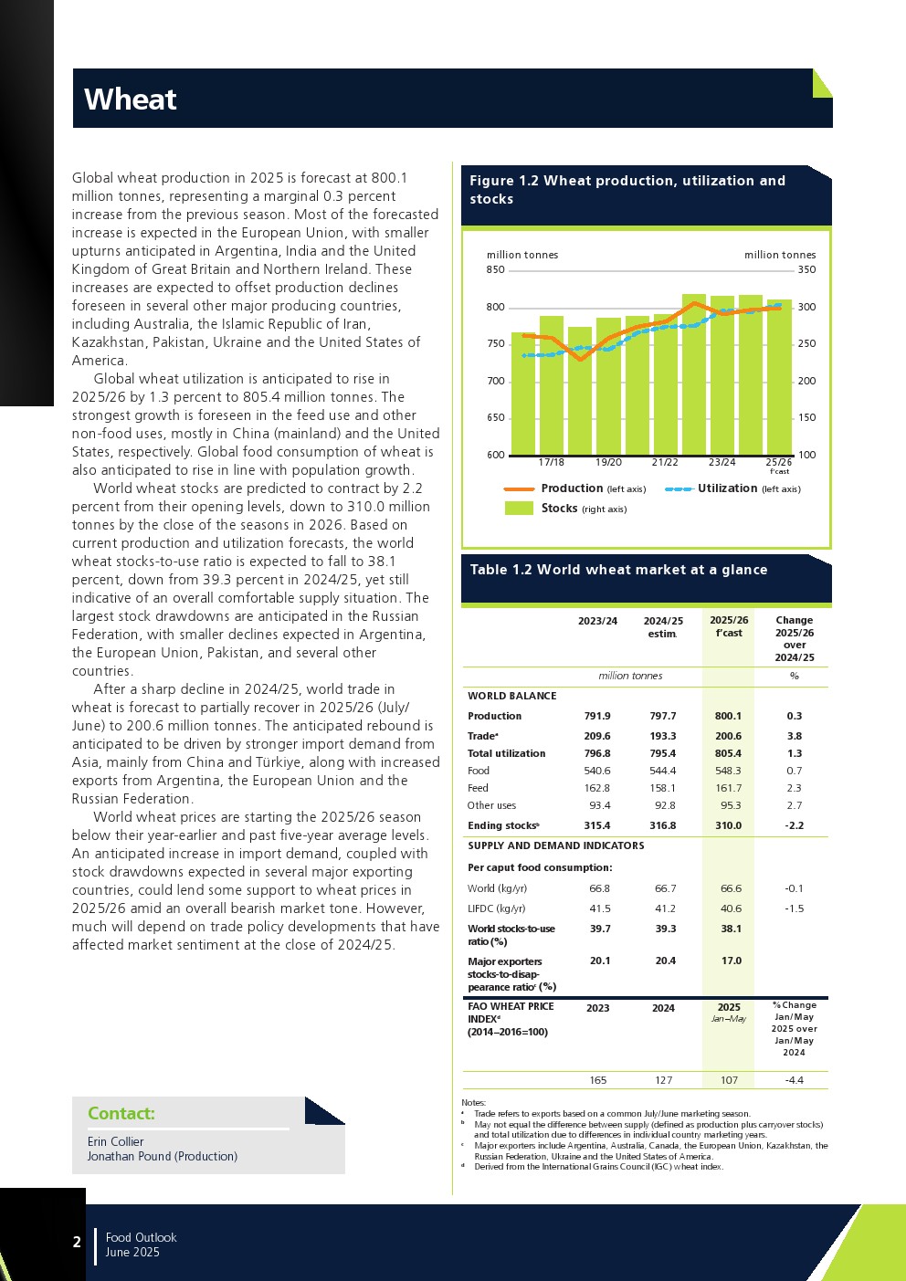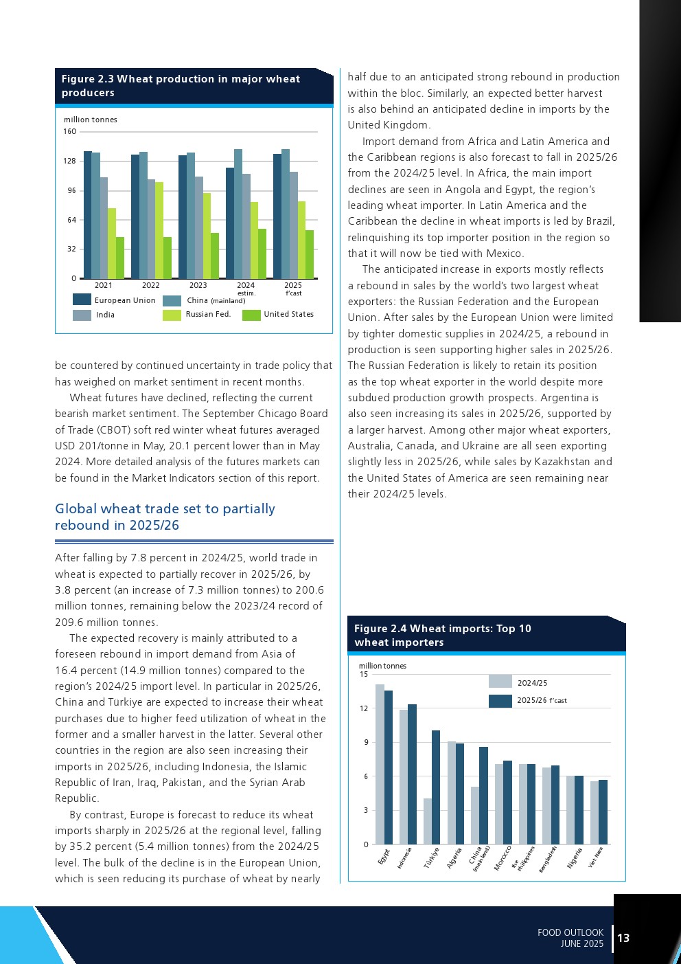 联合国粮农组织发布了“2025年年中食品展望报告”。最新评估显示,除糖类外,所有食品商品市场生产前景相对乐观,预计都将增产。但这一增长对库存恢复的影响将因供需间的微妙平衡而各异。全球食品商品生产仍易受天气条件影响。此外,冲突与地缘政治紧张局势升级、贸易政策及相关措施的不确定性、以及经济挫折都可能对贸易前景产生负面影响。