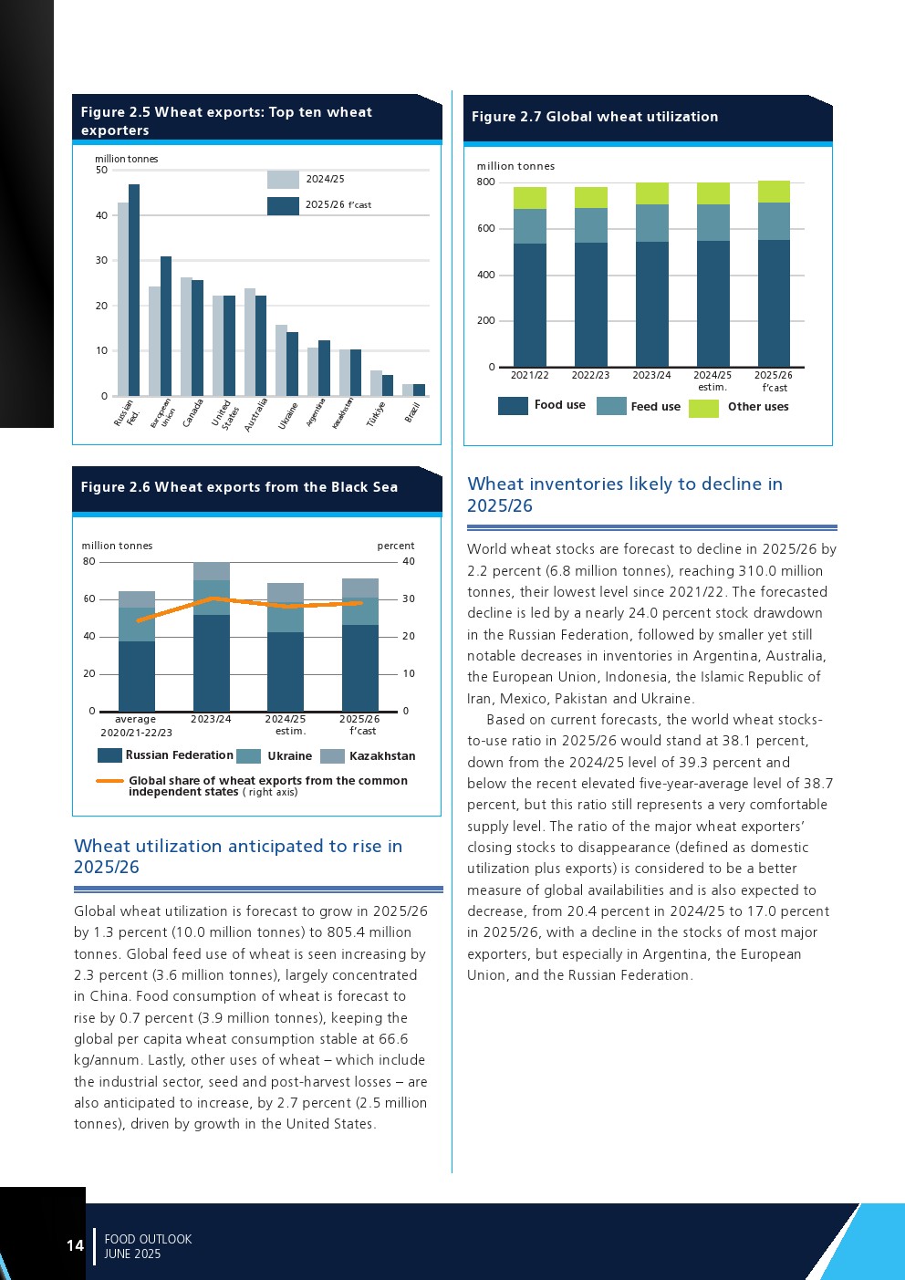 2025/26年度,全球小麦使用量增速预计将超过产量的小幅增长,导致库存减少(主要出口国尤甚)。全球小麦贸易量预计将从上季度的下滑中部分恢复,主要受亚洲进口需求预期回升推动。