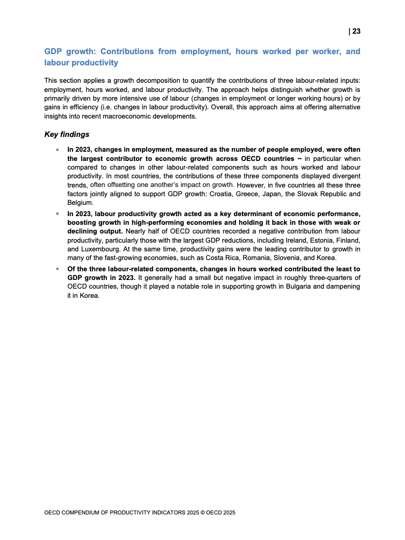 全球生产力增长呈现低迷态势。2023年OECD经济体劳动生产率平均仅增长0.6%,而欧元区则录得负0.9%的显著下滑,为2009年金融危机以来的最差表现。增长动力主要源于劳动投入量的增加,而非效率提升。多要素生产率(MFP)的停滞乃至负增长,以及资本深化贡献的微弱,是导致这一疲软局面的核心驱动因素。