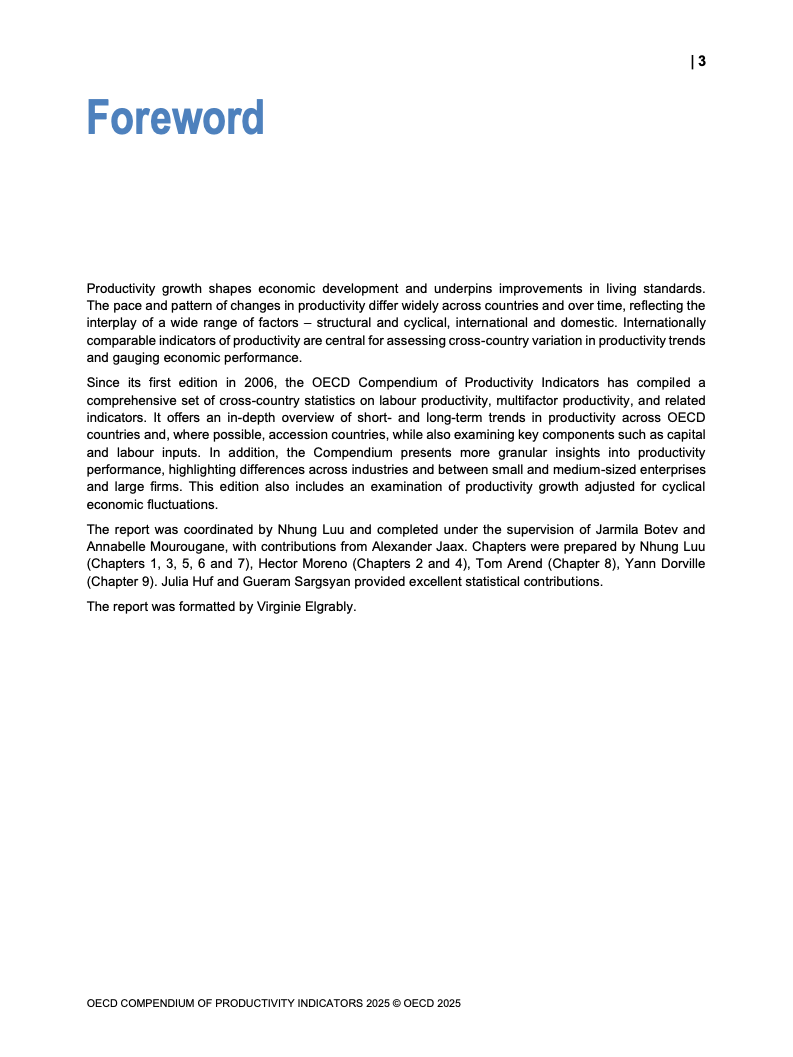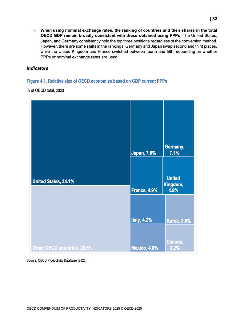 从跨国比较视角看,经购买力平价(PPP)调整后,美国占OECD总GDP的34%。尽管自2000年以来成员国生产率水平存在趋同趋势,但国别差异依然悬殊,最高与最低水平国家相差近六倍。这些差异更多由营商环境、监管框架等长期结构性因素决定,而非短期经济周期波动。
