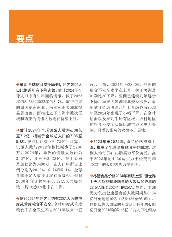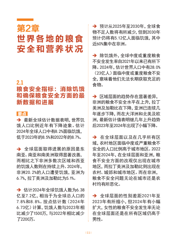 最新全球估计数据表明,世界饥饿人口比例近年有下降迹象。估计2024年全球人口中有8.2%面临饥饿,低于2023年的8.5%和2022年的8.7%。取得进展的原因是东南亚、南亚和南美洲取得显著改善,而相比之下非洲多数次区域和西亚的饥饿人数则在持续上升。