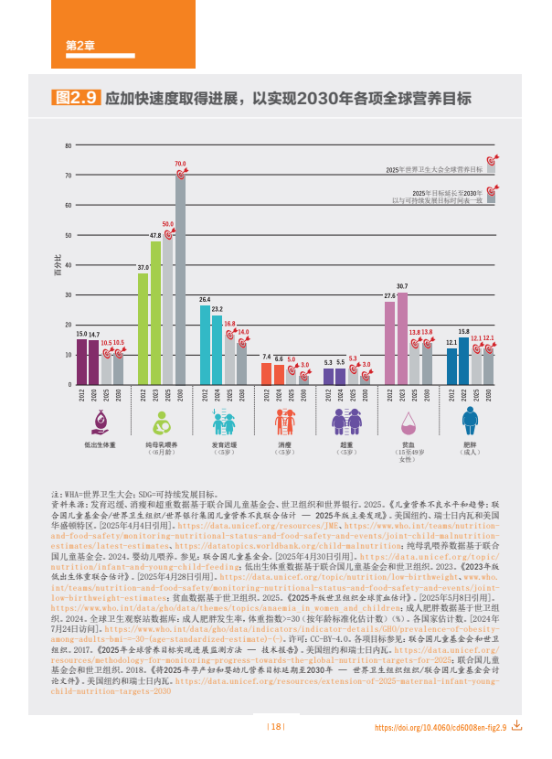 应加快进展速度,实现与儿童营养不良关键指标相关的2030年全球目标。世界己在降低儿童发育迟缓率方面取得进展,发育迟缓发生率已从2012年的26.4%降至2024年的23.2%。全球儿童消瘦发生率和儿童超重发生率同期基本维持不变,估计2024年分别为6.6%和5.5%。相比之下,六月龄以下婴儿纯母乳喂养比例则从2012年37.0%大幅升至2023年的47.8%。为推广纯母乳喂养而采取的行动有助于提升一生的营养状况。