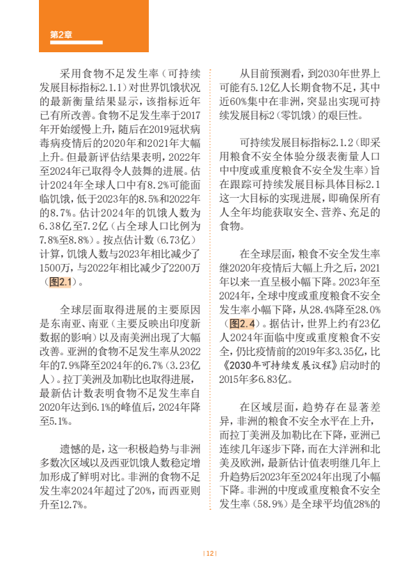 估计2024年世界上约有23亿人面临中度或重度粮食不安全。全球中度或重度粮食不安全发生率自2021年以来一直逐步下降,2024年28.0%。非洲的粮食不安全水平在上升,拉丁美洲及加勒比在下降,亚洲已连续几年逐步下降,而在大洋洲和北美及欧洲,最新估计值表明继几年上升趋势后2023年至2024年出现了小幅下降。在全球层面以及在几乎所有区域,农村地区的粮食不安全状况比城市地区更为普遍,且受其影响的女性多于男性。