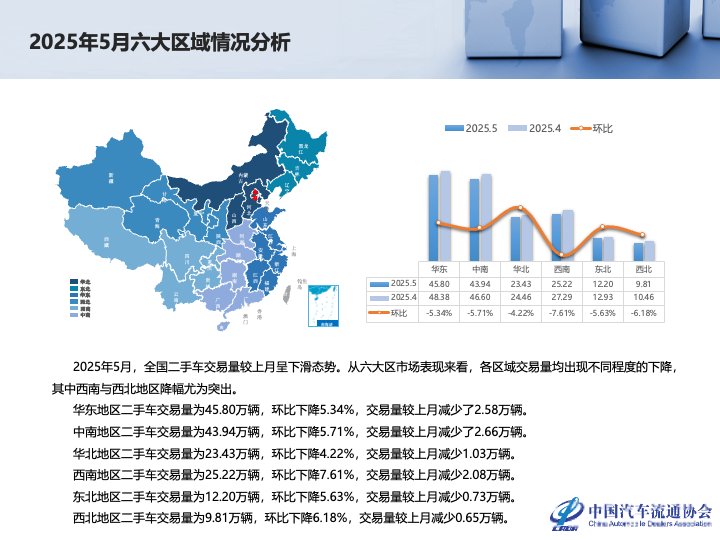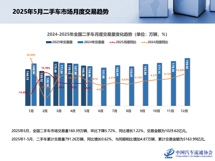2025年5月,全国二手车市场交易量160.39万辆,环比下降5.72%,同比增长1.22%,交易金额为1029.62亿元。