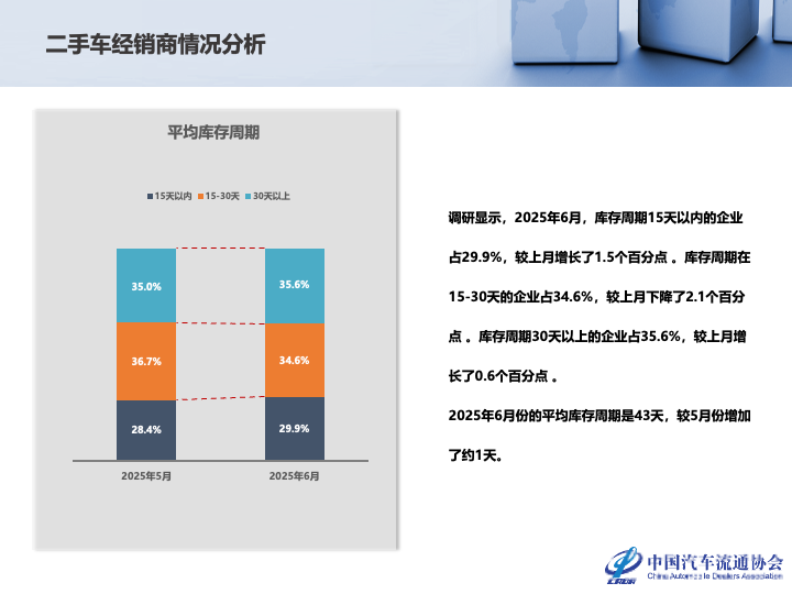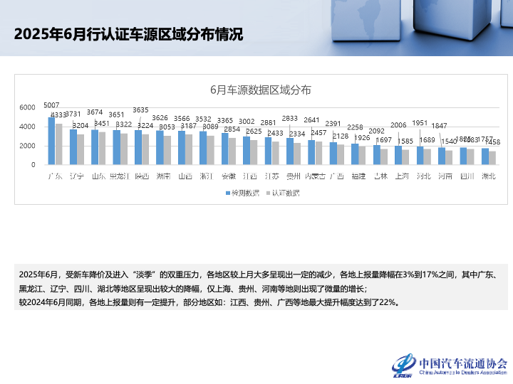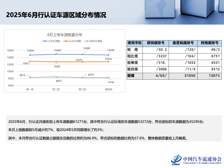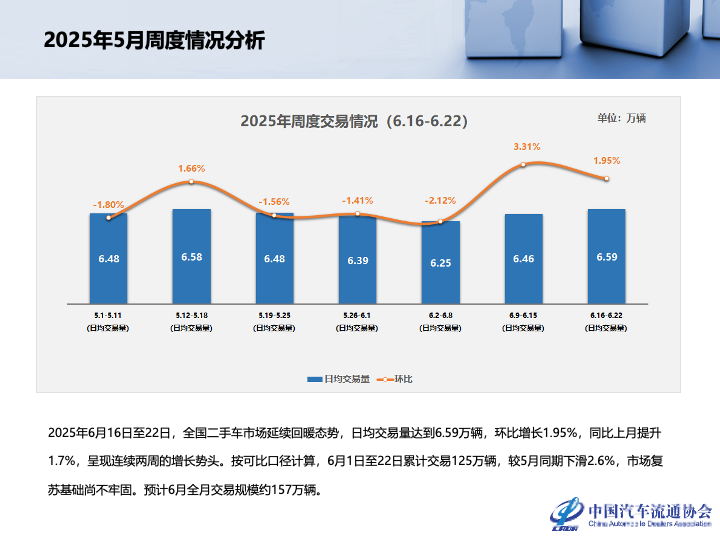 2025年6月16日至22日,全国二手车市场延续回暖态势,日均交易量达到6.59万辆,环比增长1.95%,同比上月提升1.7%,呈现连续两周的增长势头。按可比口径计算,6月1日至22日累计交易125万辆,较5月同期下滑2.6%,市场复苏基础尚不牢固。预计6月全月交易规模约157万辆。