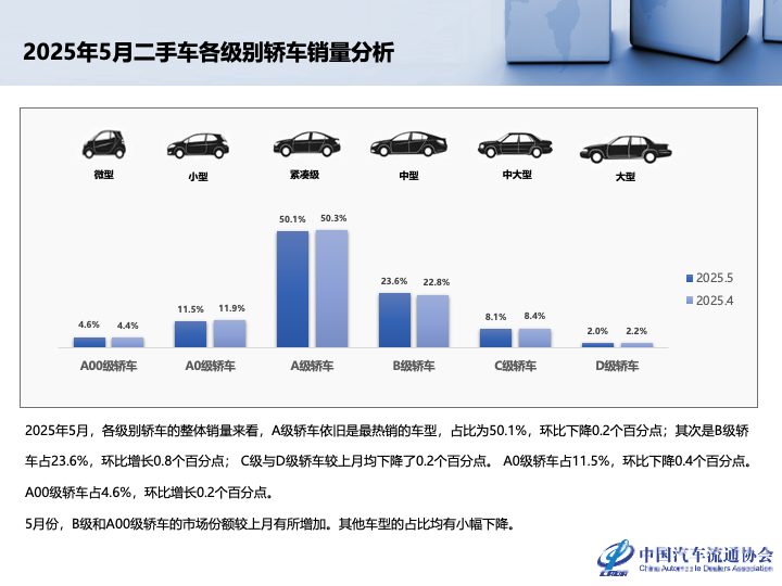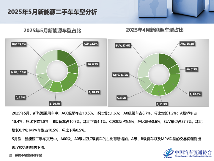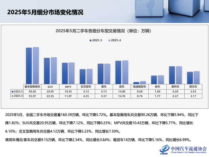2025年5月,全国二手车市场交易量160.39万辆,环比下降5.72%。基本型乘用车共交易90.26万辆,环比下降5.94%,同比下降1.82%;SUV共交易20.95万辆,环比下降7.12%,同比下降0.23%;MPV共交易10.43万辆,环比下降5.77%,同比增长6.10%;交叉型乘用车共交易4.12万辆,环比下降5.23%,同比增长7.59%。
