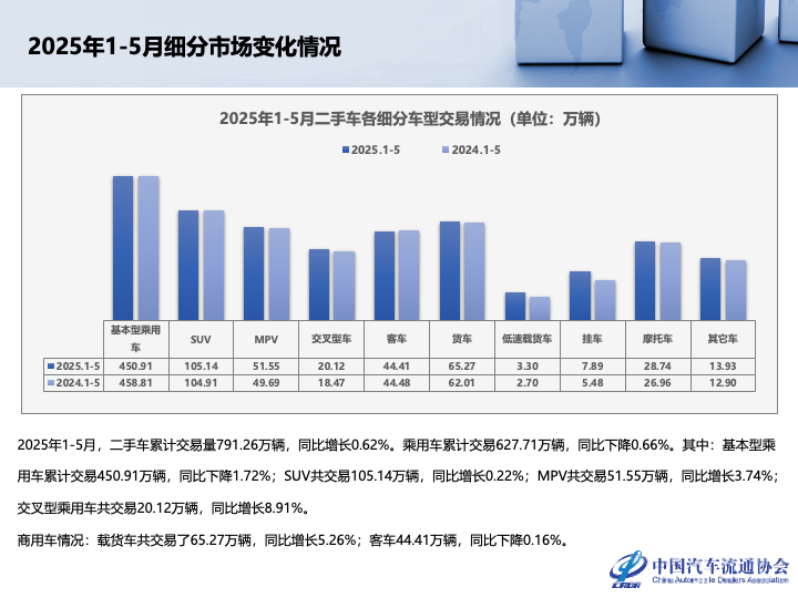 2025年1-5月,二手车累计交易量791.26万辆,同比增长0.62%,与同期相比增加4.87万辆,累计交易金额为5163.99亿元。