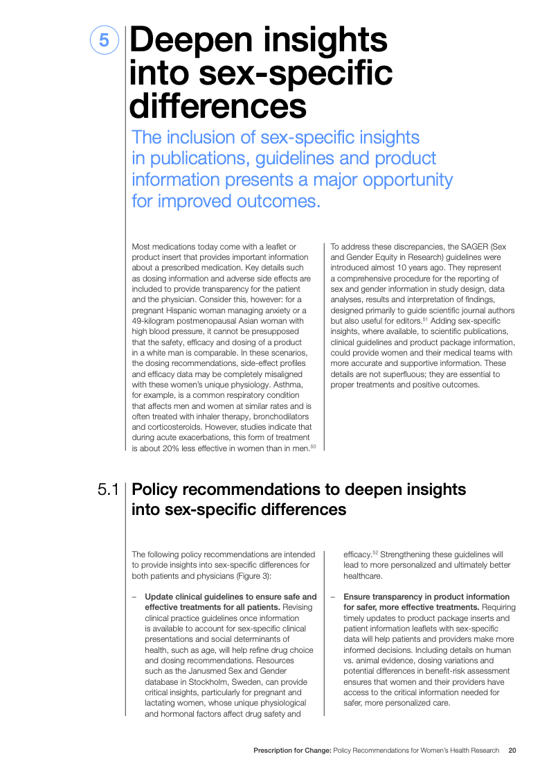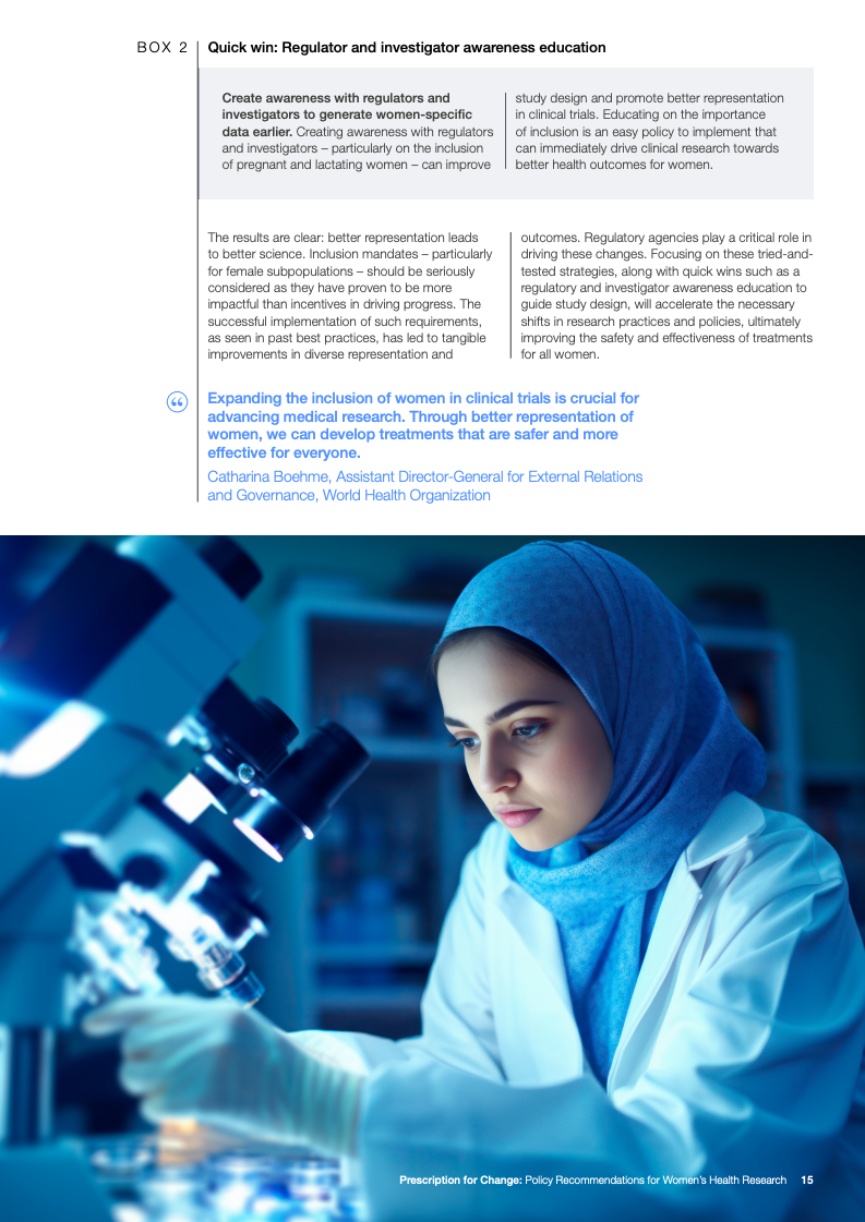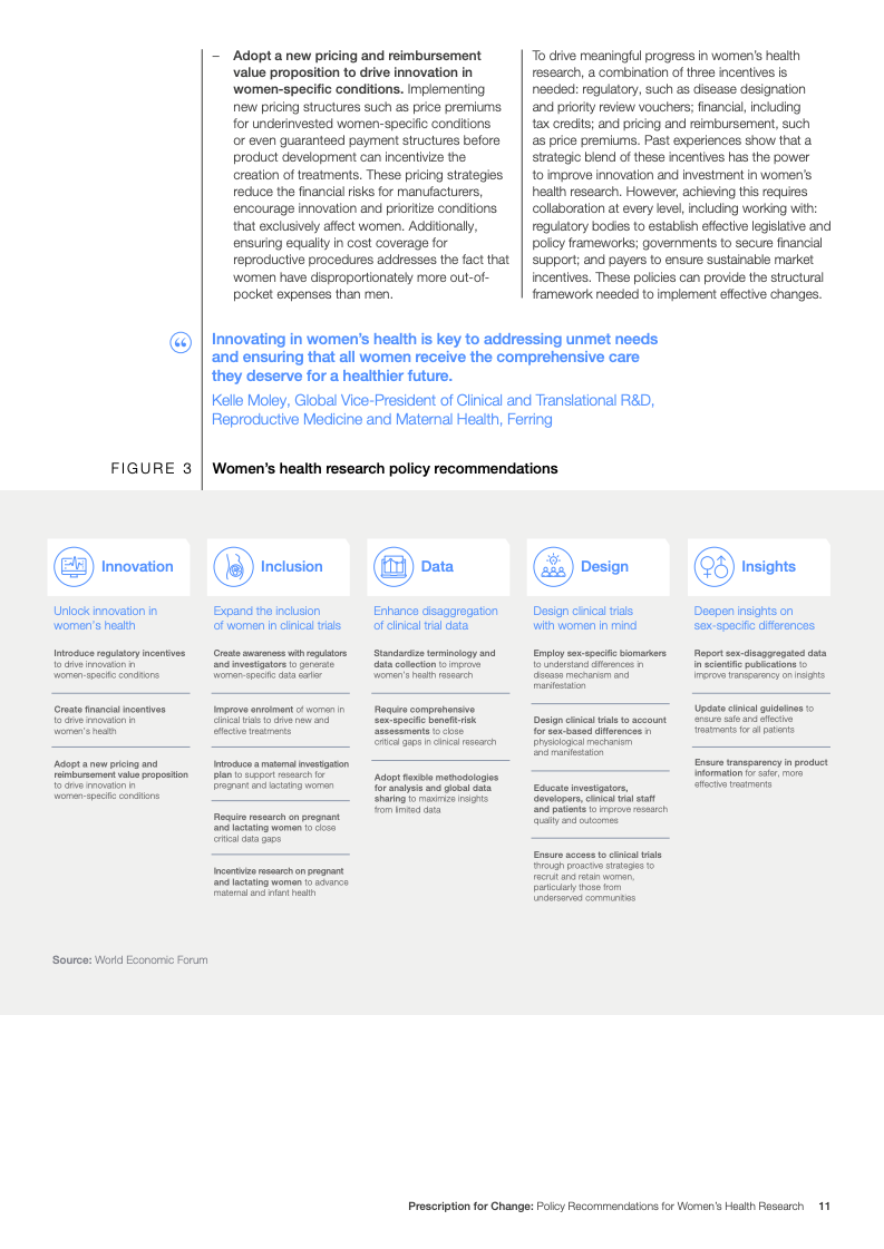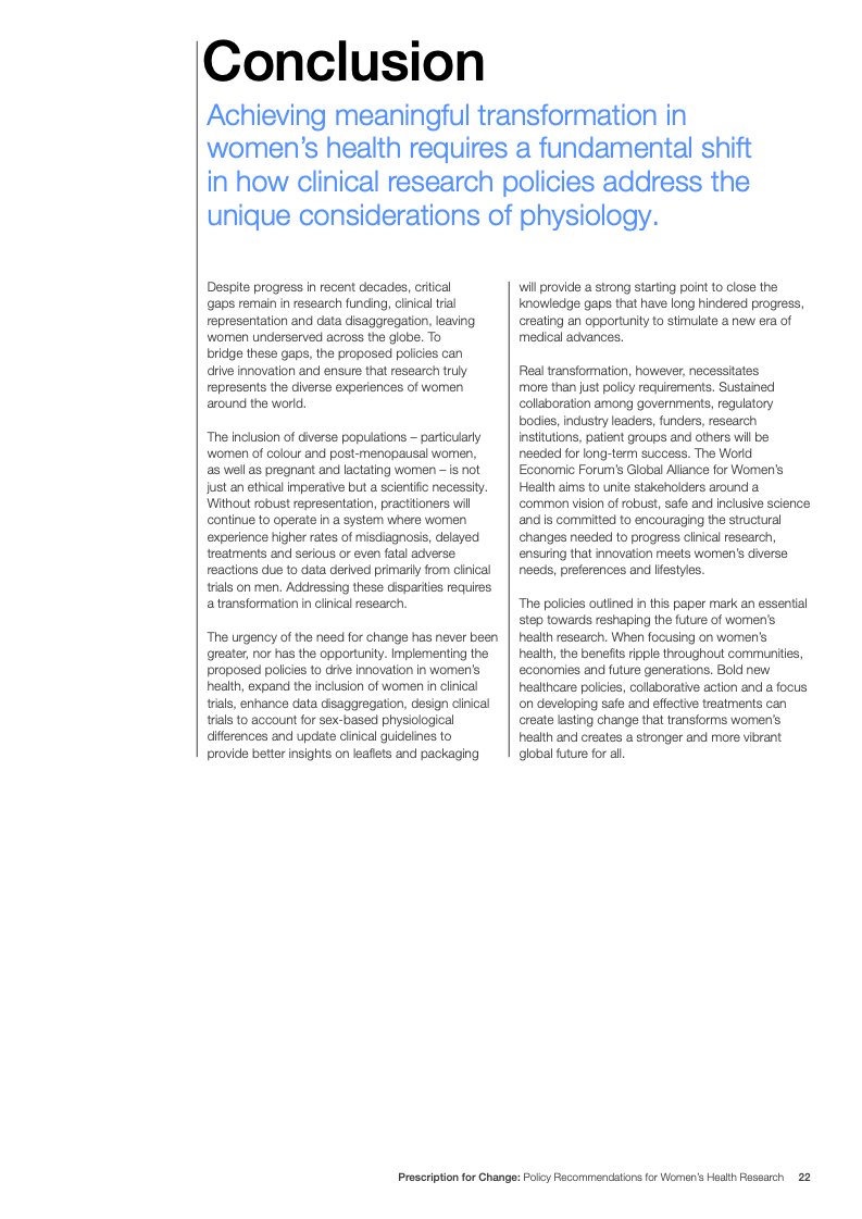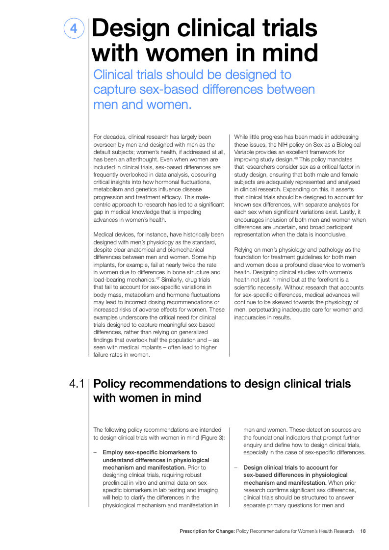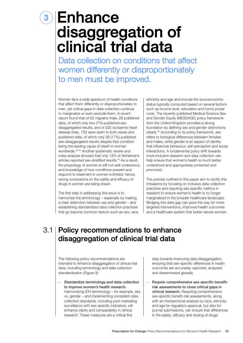为解决这一差距,文章提出了五项关键政策杠杆:释放女性健康领域的创新潜力,扩大女性在临床试验中的参与规模,改善临床试验数据的性别细分分析,设计以女性为中心的临床试验,以及深化对性别特异性差异的理解。