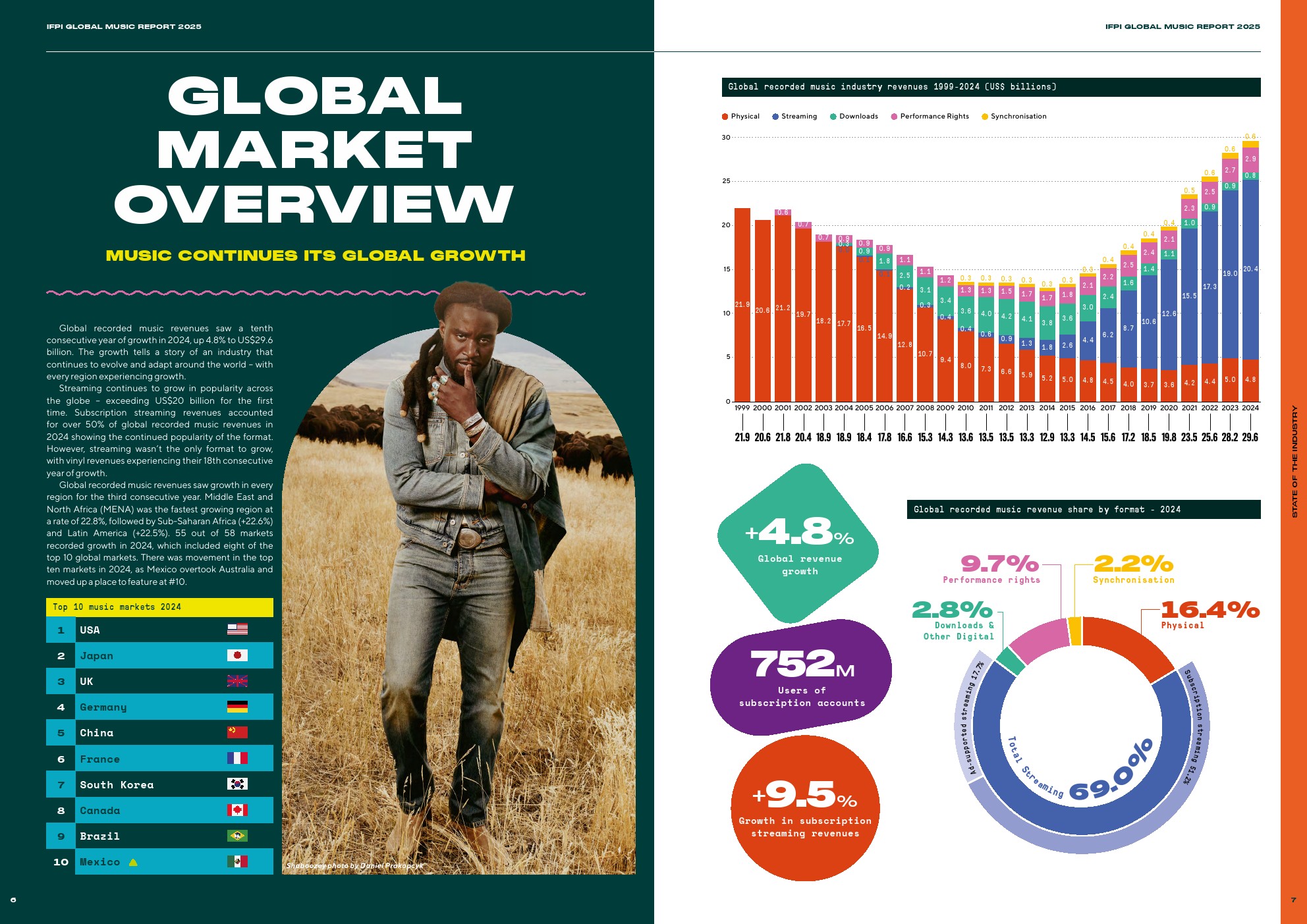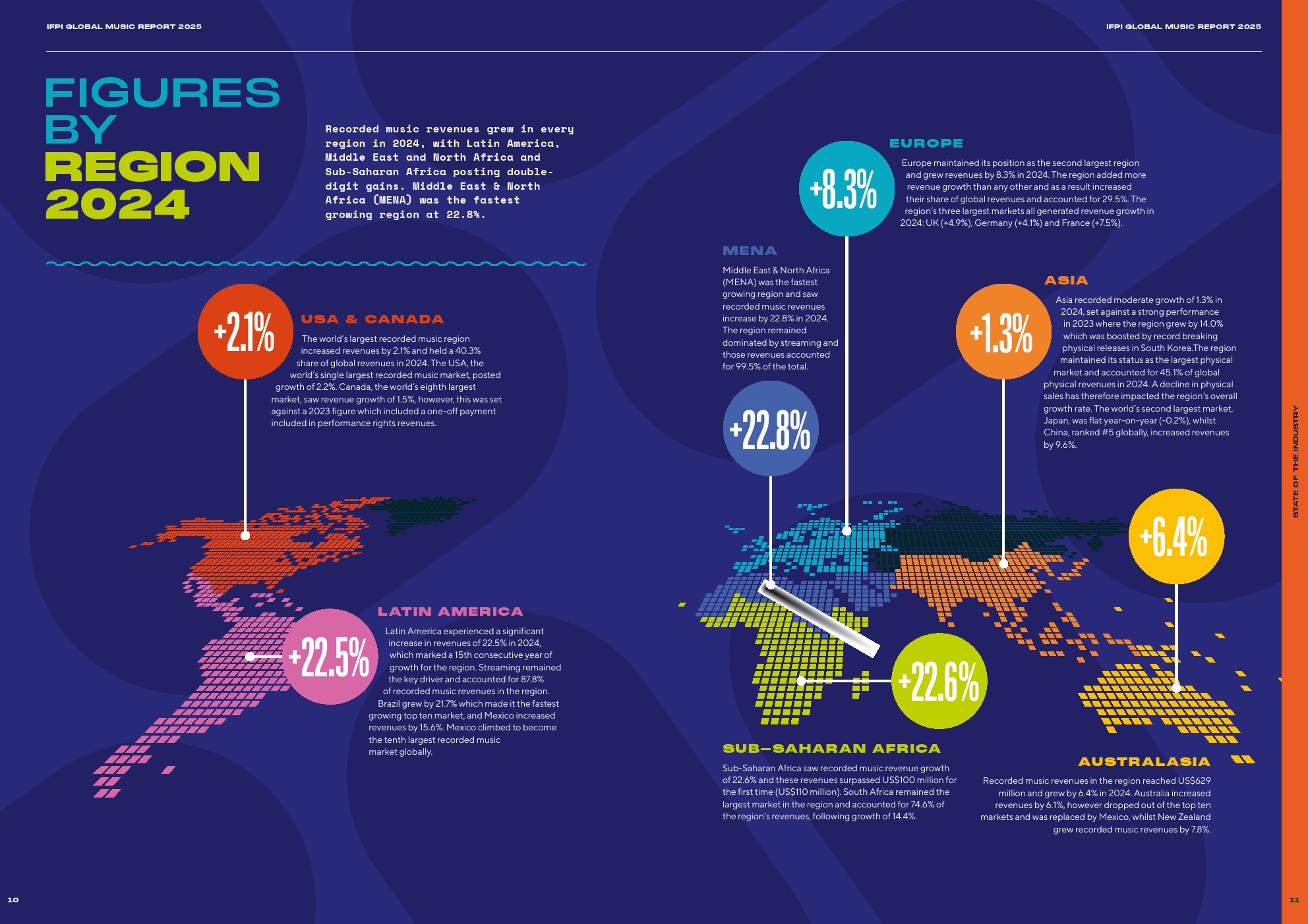 2024年,全球唱片收入连续第10年增长,增长4.8%,达到296亿美元。这一增长讲述了一个行业在全球范围内不断发展和适应的故事——每个地区都在经历增长。