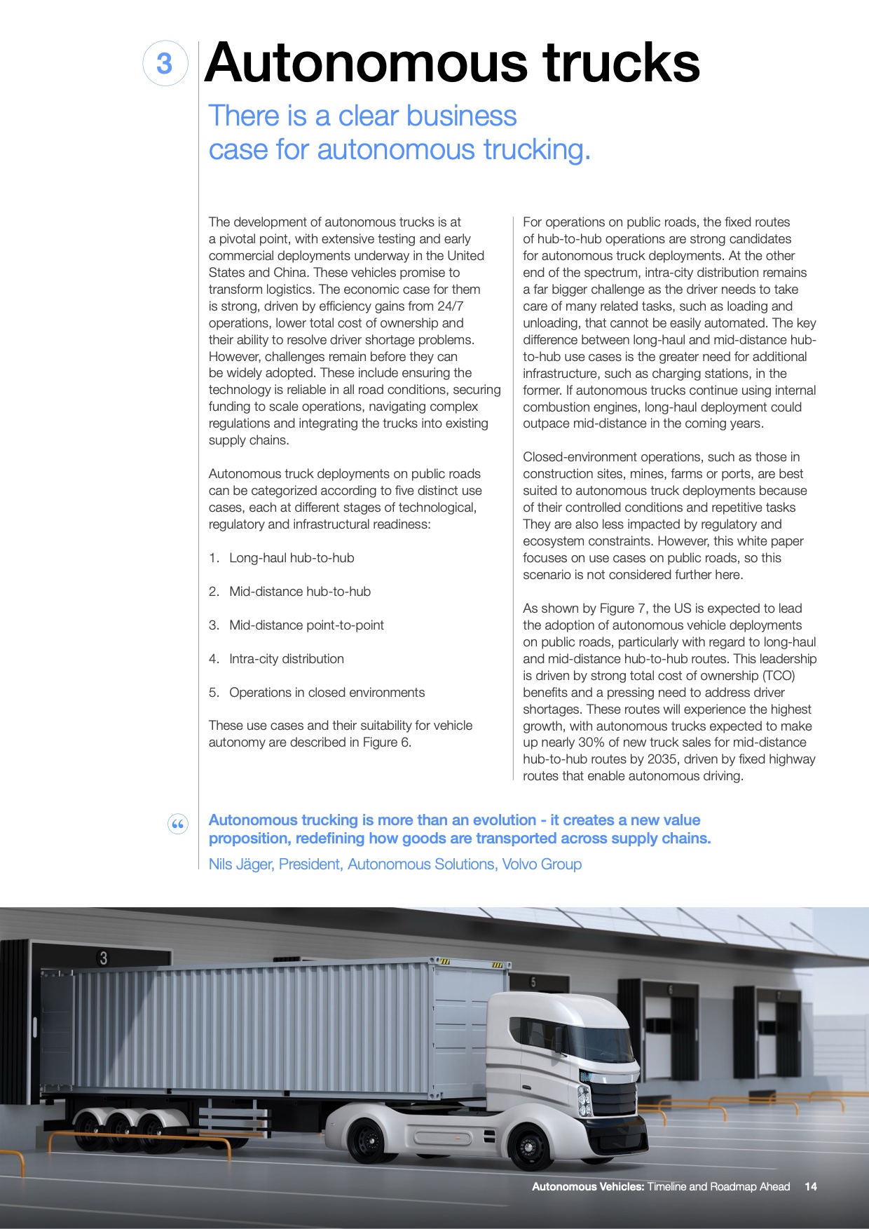 自动驾驶卡车被视为物流行业的变革力量,其发展已步入正轨,尤其在中美两国已进入测试及早期商业应用阶段。报告预计,到2035年,美国新卡车销量中将有近30%用于中途运输枢纽间线路的自动驾驶卡车,允许自动化驾驶的固定高速公路路线是实现这一目标的关键。
