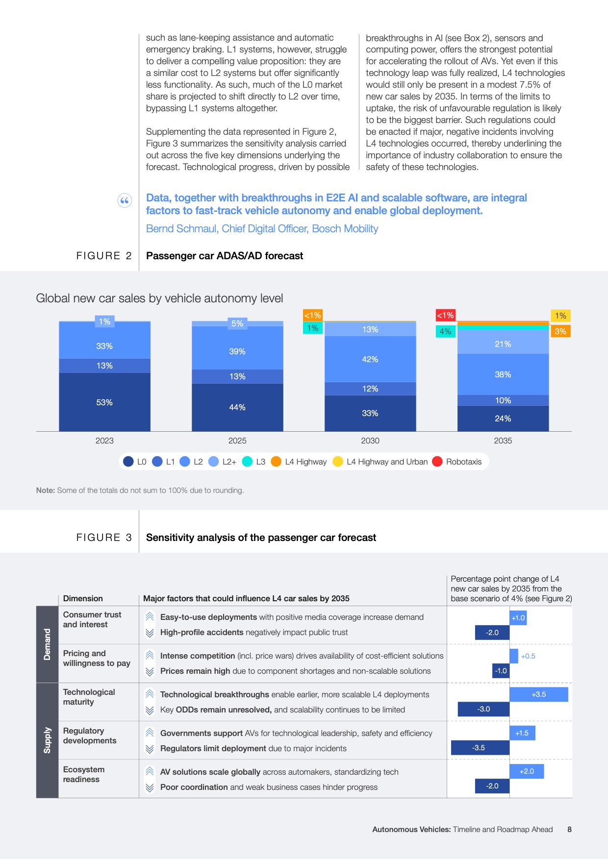 针对私家车市场,报告预测自动化将是渐进式演变而非革命性突破。到2030年,L2和L2+级别的高级辅助驾驶功能可能在新车中占据最主要地位。白皮书强调,在2035年之后很长一段时间内,大多数新车的驾驶员仍需手动操控,L4级自动驾驶仍受技术、法规及高昂成本的严重限制。
