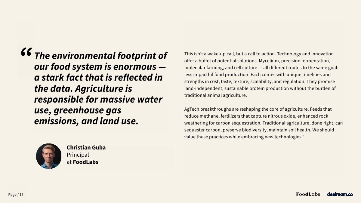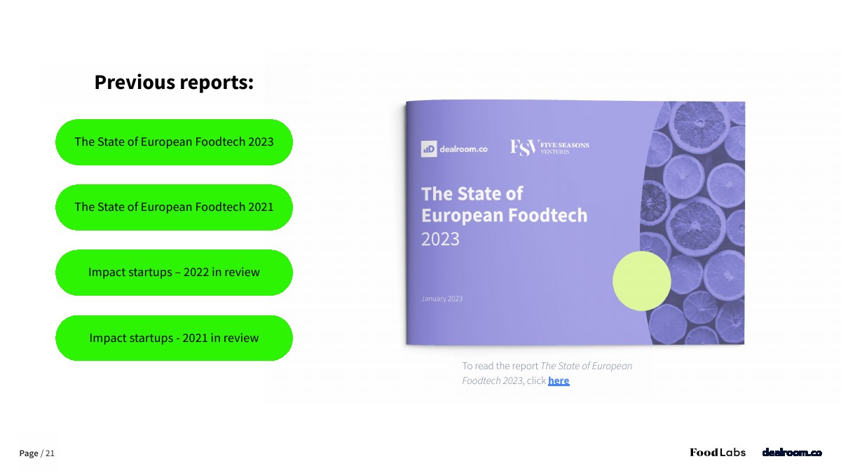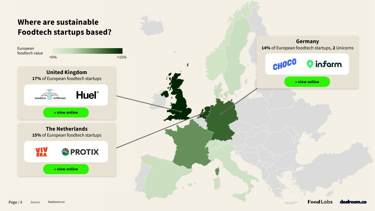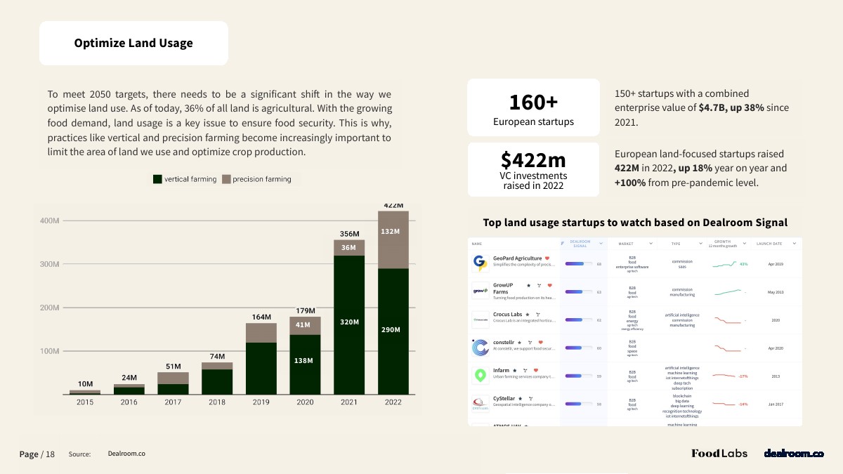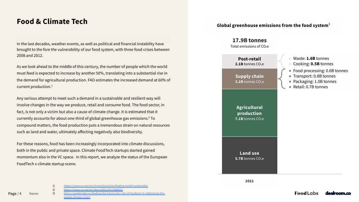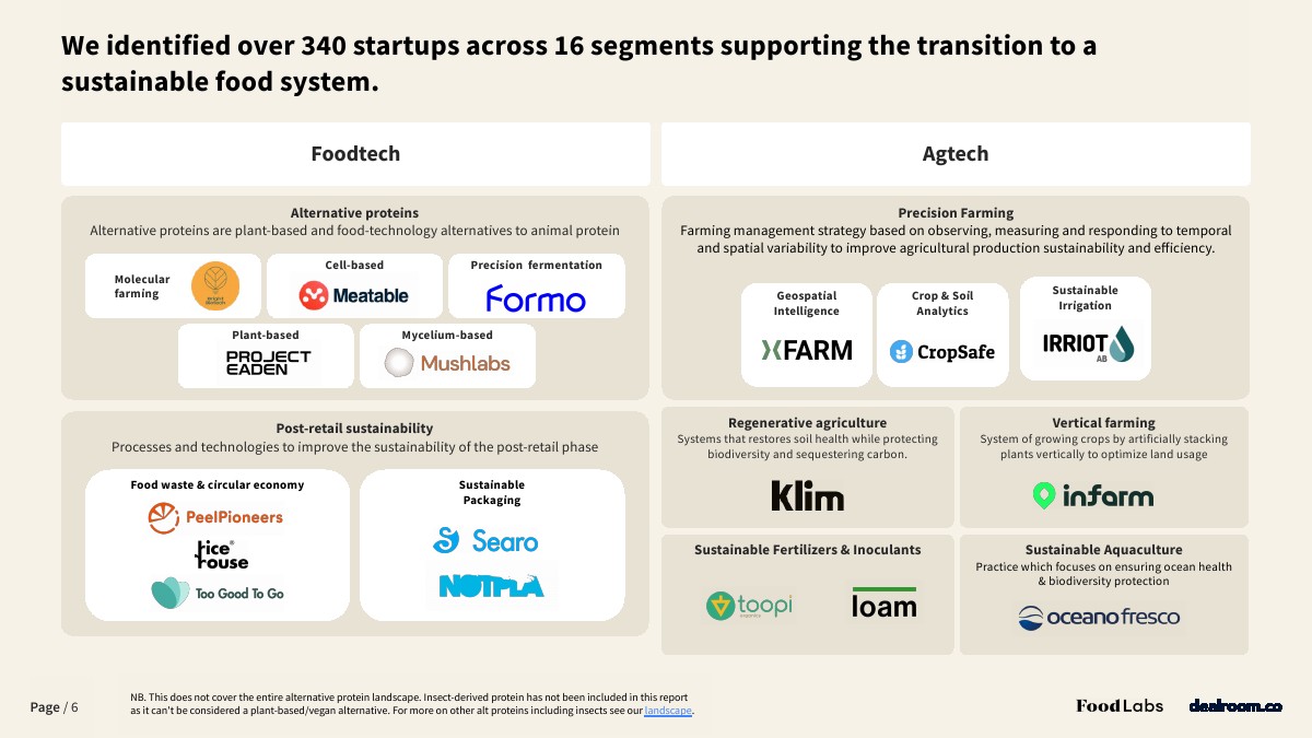 由于这些原因,无论在公共空间还是在私人空间,粮食问题越来越多地被纳入气候主题。气候食品科技初创公司在风投领域也获得了发展势头。Dealroom分析了欧洲食品科技与气候创业场景的现状,并确定了16个领域的340多家初创公司,支持向可持续食品系统的过渡。