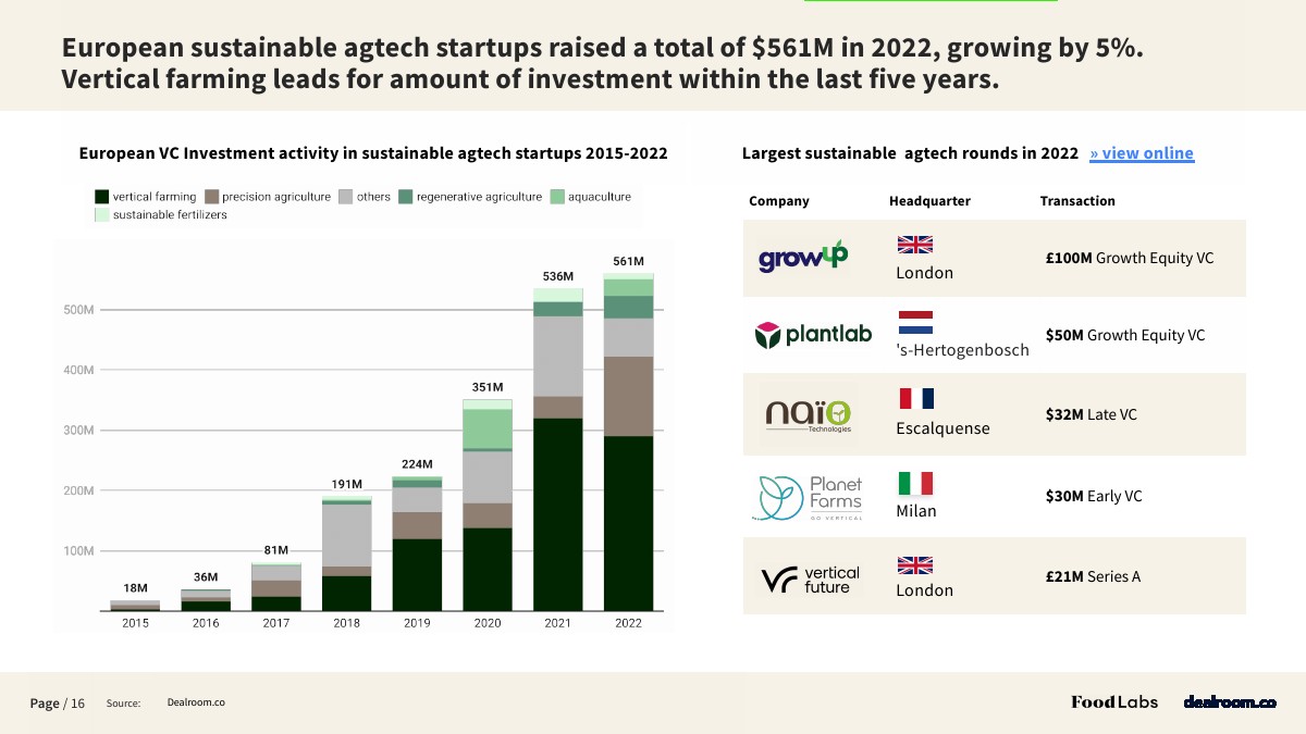 欧洲可持续农业科技初创公司在2022年共筹集了5.61亿美元,增长了5%。垂直农业在近五年内的投资额中处于领先地位。