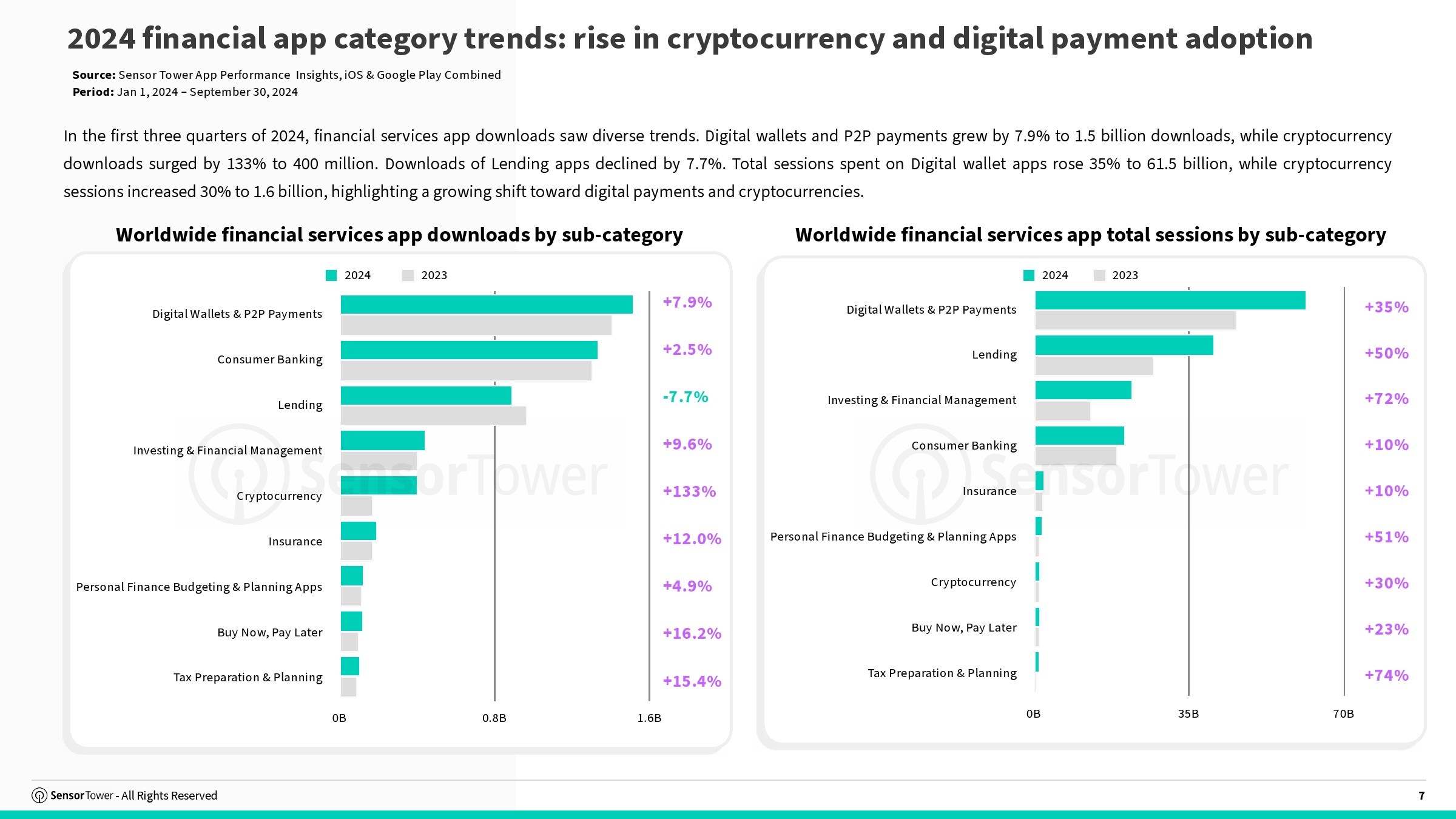 2024年前三个季度,金融服务应用下载呈现出多种趋势。数字钱包和P2P支付下载量增长7.9%,达到15亿次,而加密货币下载量飙升133%,达到4亿次。借贷应用的下载量下降了7.7%。数字钱包应用程序的总花费增长了35%,达到615亿次,而加密货币的总花费增长了30%,达到16亿次,突显出向数字支付和加密货币的日益转变。
