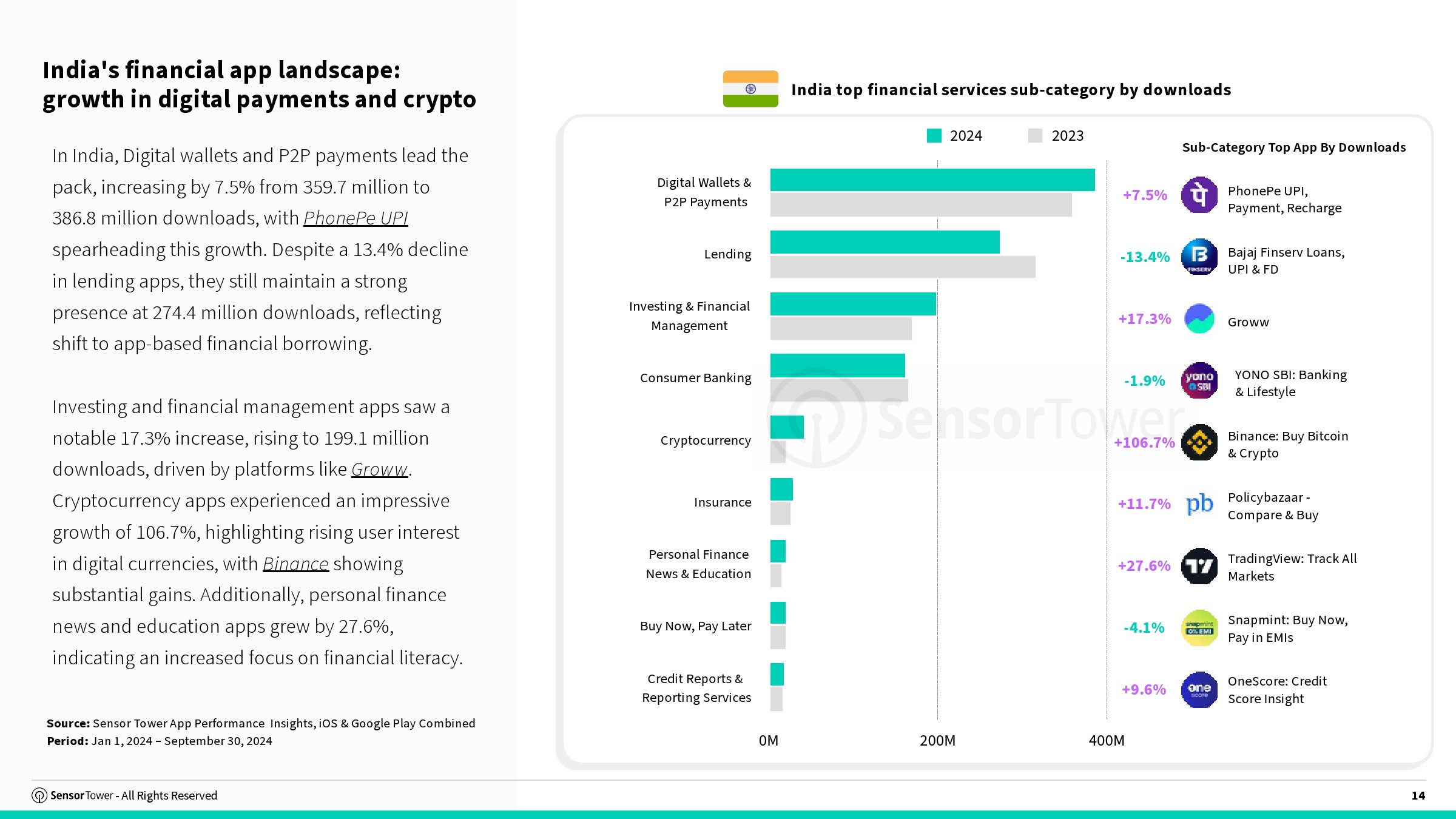 全球金融服务应用程序的下载量已从2020年的46亿次增长至2024年的77亿次,其中印度的下载量增长最快,从2022年的15亿次增长到2024年的17亿次。