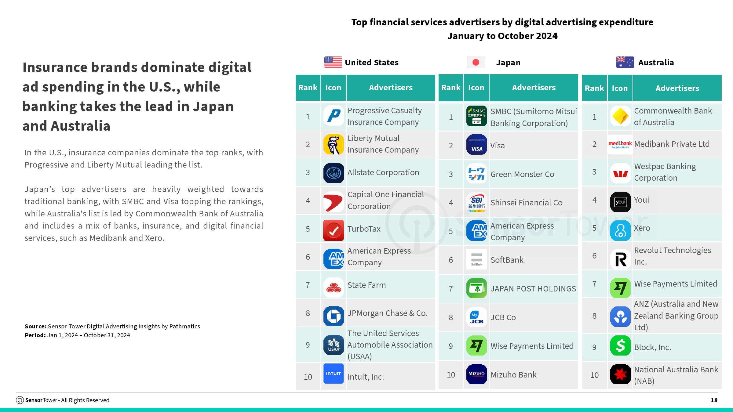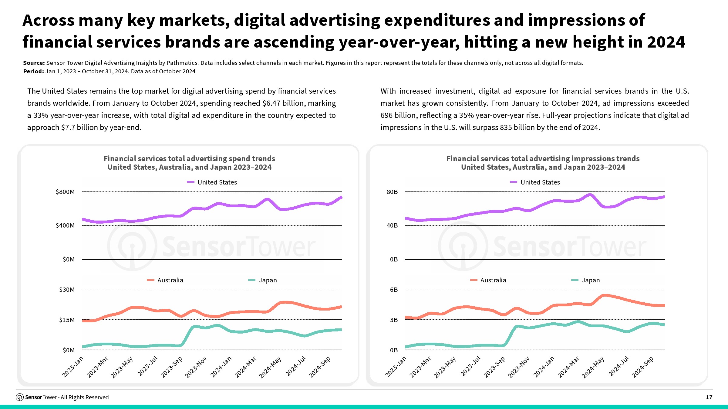 在许多关键市场,金融服务品牌的数字广告支出和展现量都在逐年上升,并在2024年达到新的高度
