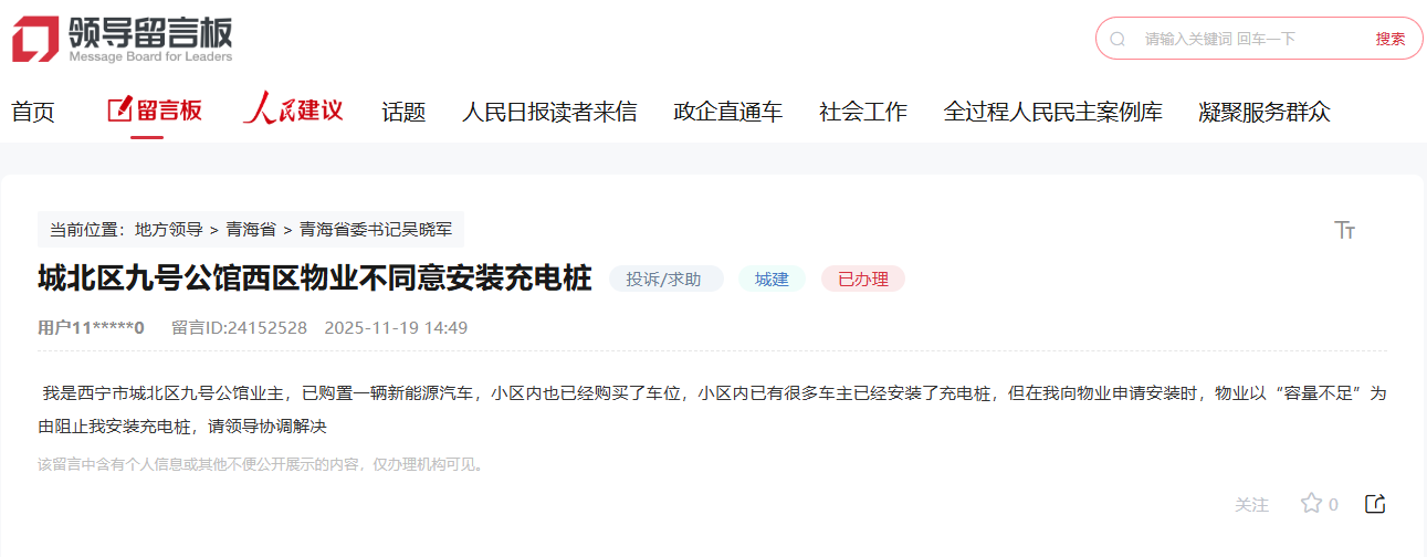 近年来,青海省多个地区的居民在人民网“领导留言板”上反映了安装充电桩时遇到的各类问题。