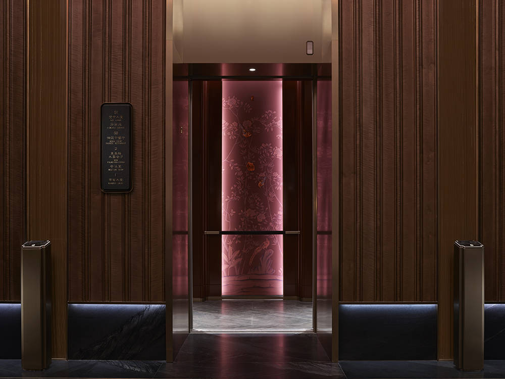 电梯轿厢亦暗藏巧思:灵感源自古典轿辇,以考究的木艺、温润的锦缎和精巧的真丝刺绣,复刻出那份独有的尊贵与仪式感,于起落之间,尽显现代东方的匠心风骨。