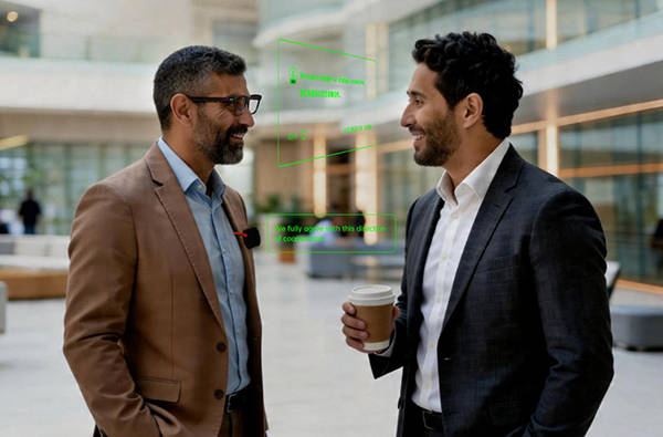 目前行业主流的“对话”翻译模式,是表达的内容被翻译后显示在手机上,您拿给对方看。INMO GO3则是将您讲的内容,通过INMO Speaker实时翻译并以您独有音色播报给对方,不需要来回传递手机。