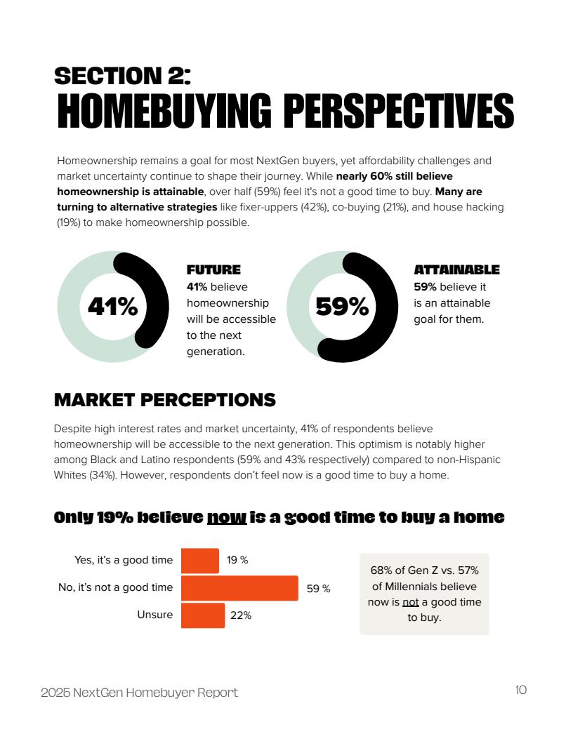 面对现实压力,购房者正积极拥抱非传统策略以规避支付能力不足的困境。购买待修缮房屋(42%)、联合购房(21%)以及“房屋黑客”(House Hacking,出租部分房屋分摊贷款,19%)等创新模式日益普及。特别是在Z世代中,高达32%的人考虑联合购房,这一比例远高于千禧一代的18%,显示出更强的财务灵活性与合作意愿。