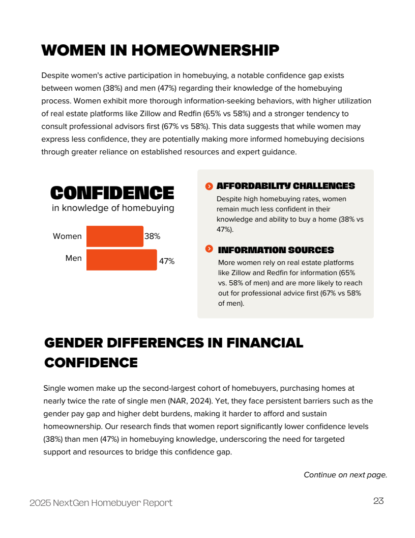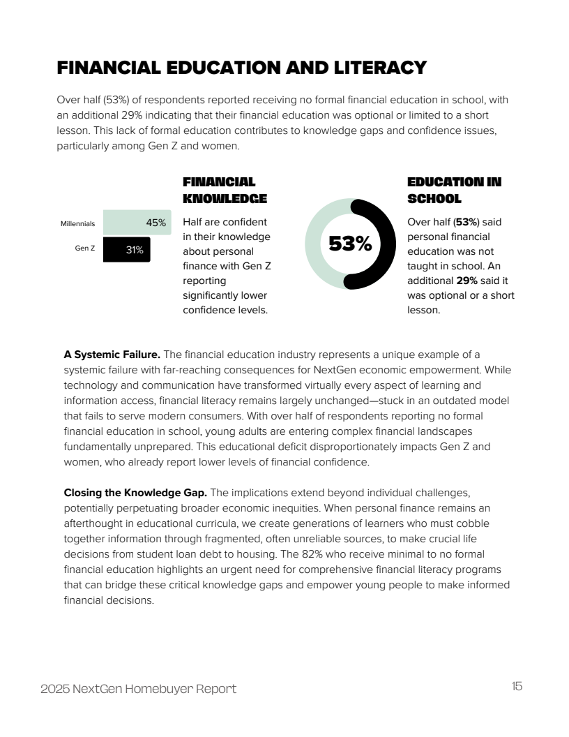 这些挑战的背后,是金融素养的普遍缺失。超过半数(53%)的受访者表示在校期间未接受过正式的个人理财教育,另有29%表示相关课程仅为选修或简短介绍。这种教育缺失直接导致了信心的不足,Z世代中仅有43%的人对自己的理财知识有信心,显著低于千禧一代的53%。女性在购房知识方面的信心度(38%)也明显低于男性(47%)。