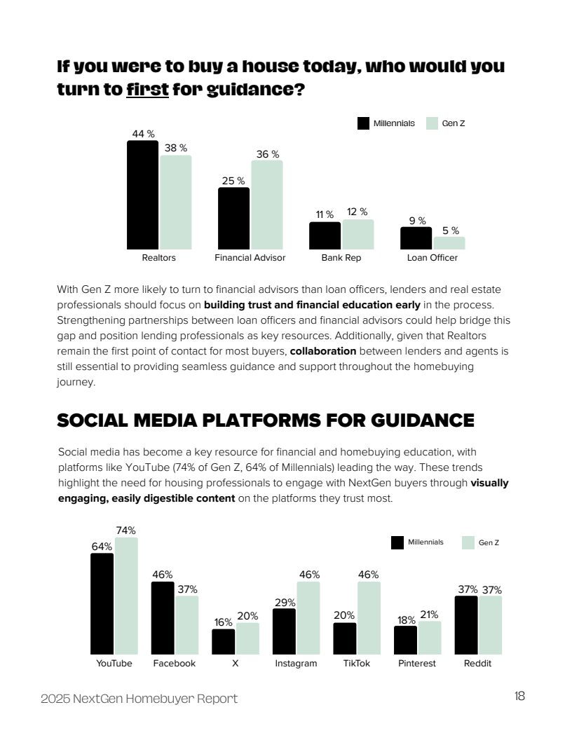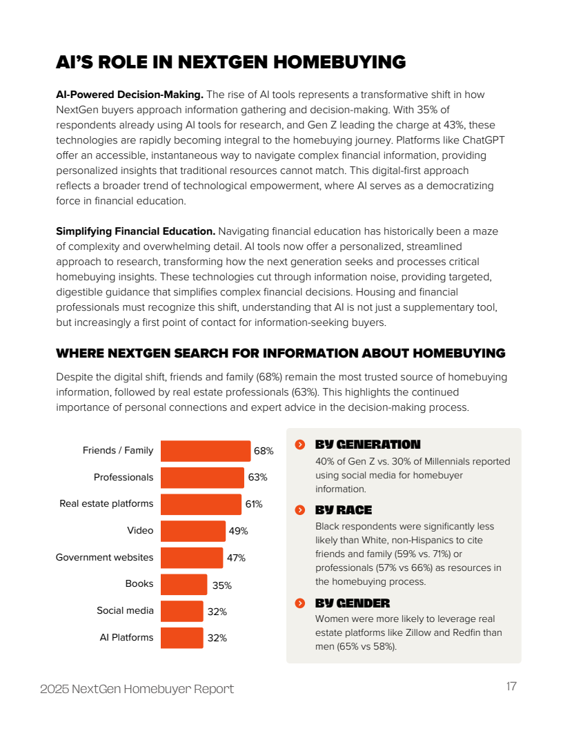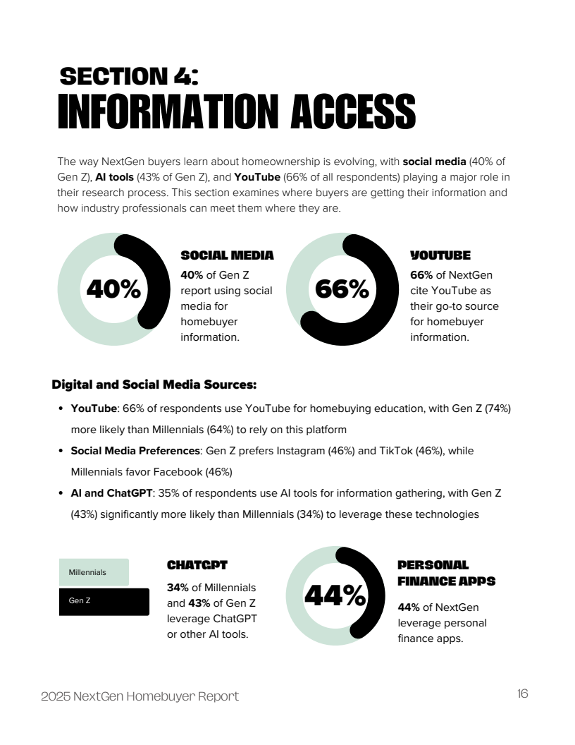 信任的流失正从根本上重塑信息获取路径。高达66%的受访者将YouTube视为购房教育的首选平台,凸显了视频化、非正式学习渠道的主导地位。尤其值得关注的是,40%的Z世代(18-24岁)通过社交媒体进行购房研究,35%的受访者已开始使用ChatGPT等人工智能工具获取信息,其中Z世代的使用率更是达到43%,远超千禧一代。