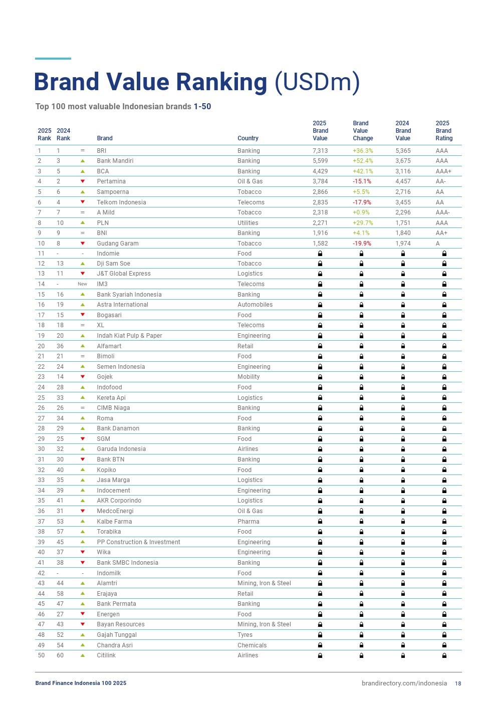BRI连续第三年蝉联印尼最具价值品牌,其品牌价值增长36%,达到73亿美元。2022至2025年间,BRI品牌价值的增长源于其对金融包容性的承诺、对中小微企业(MSME)的大力支持以及持续推进的数字化转型。数字服务创新和网络扩展进一步提升了客户体验和信任度。